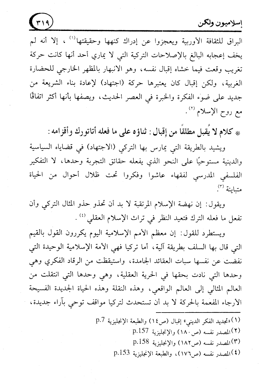 (1) "تجديد الفكر الديني" إقبال (ص 14) والطبعة الإنجليزية P. 7.