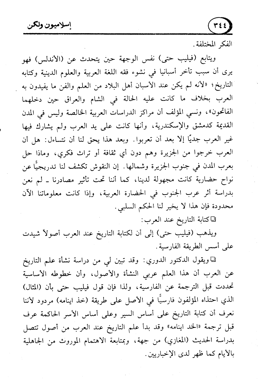 ويذهب (فيليب حتى) إلى أن لكتابة التاريخ عند العرب أصولاً شيدت على أسس الطريقة الفارسية.