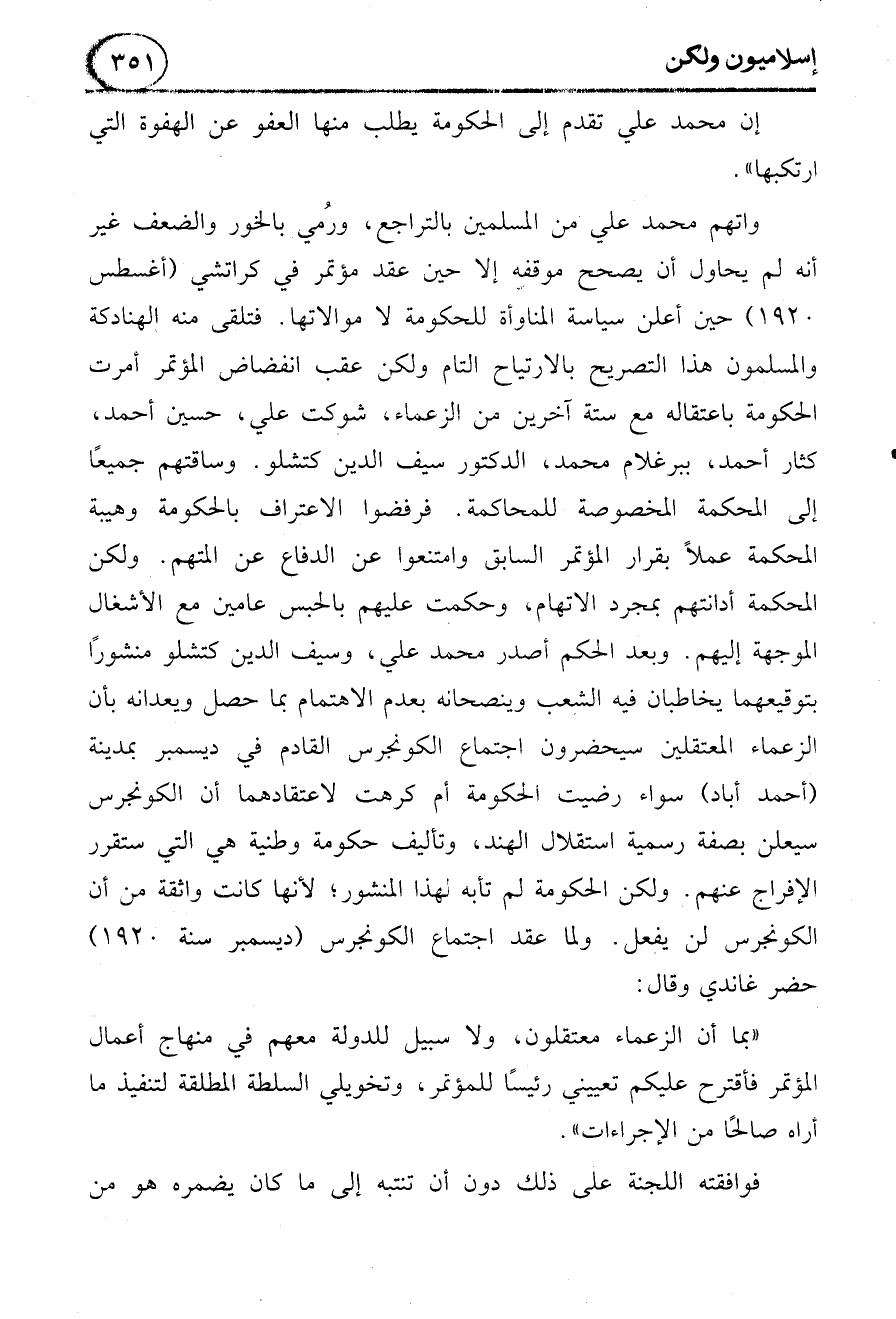 واتهم محمد علي من المسلمين بالتراجع، ورُمي بالخور والضعف غير أنه لم يحاول أن يصحح موقفِه إلا حين عقد مؤتمر في كراتشي (أغسطس ْ1920) حين أعلن سياسة المناوأة للحكومة لا موالاتها. فتلقى منه الهنادكة والمسلمون هذا التصريح بالارتياح التام ولكن عقب انفضاض المؤتمر أمرت الحكومة باعتقاله مع ستة آخرين من الزعماء، شوكت علي، حسين أحمد، كثار أحمد، ببرغلام محمد، الدكتور سيف الدين كتشلو. وساقتهم جميعًا إلى المحكمة المخصوصة للمحاكمة. فرفضوا الاعتراف بالحكومة وهيبة المحكمة عملاً بقرار المؤتمر السابق وامتنعوا عن الدفاع عن المتهم. ولكن المحكمة أدانتهم بمجرد الاتهام، وحكمت عليهم بالحبس عامين مع الأشغال الموجهة إليهم. وبعد الحكم أصدر محمد علي، وسيف الدين كتشلو منشورًا بتوقيعهما يخاطبان فيه الشعب وينصحانه بعدم الاهتمام بما حصل ويعدانه بأن الزعماء المعتقلين سيحضرون اجتماع الكونجرس القادم في ديسمبر بمدينة (أحمد أباد) سواء رضيت الحكومة أم كرهت لاعتقادهما أن الكونجرس سيعلن بصفة رسمية استقلال الهند، وتأليف حكومة وطنية هي التي ستقرر الإفراج عنهم. ولكن الحكومة لم تأبه لهذا المنشور؛ لأنها كانت واثقة من أن الكونجرس لن يفعل. ولما عقد اجتماع الكونجرس (ديسمبر سنة 1920) حضر غاندي وقال: