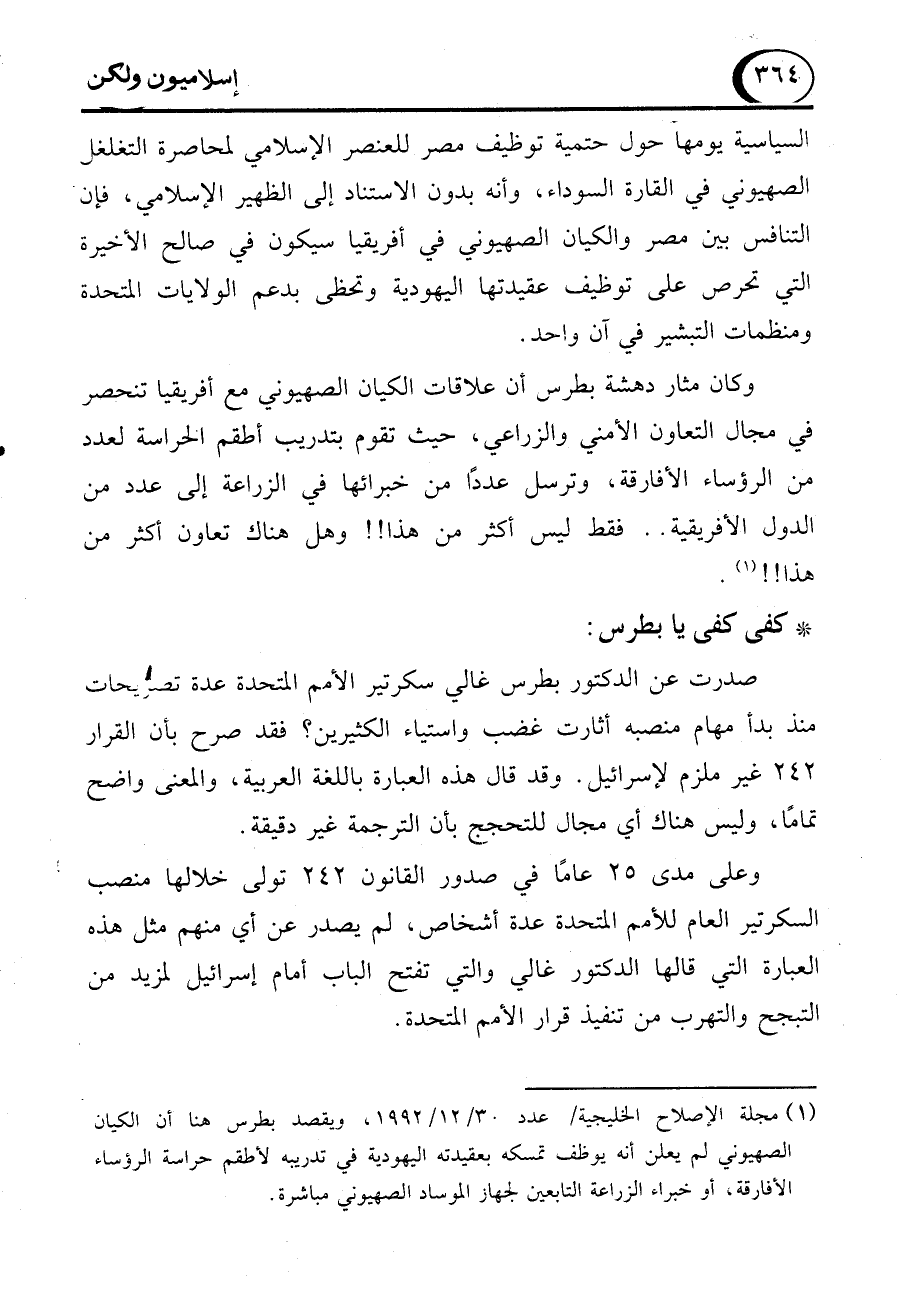 (1) مجلة الإصلاح الخليجية/عدد 30/ 12/1992، ويقصد بطرس هنا أن الكيان الصهيوني لم يعلن أنه يوظف تمسكه بعقيدته اليهودية في تدريبه لأطقم حراسة الرؤساء الأفارقة، أو خبراء الزراعة التابعين لجهاز الموساد الصهيوني مباشرة.