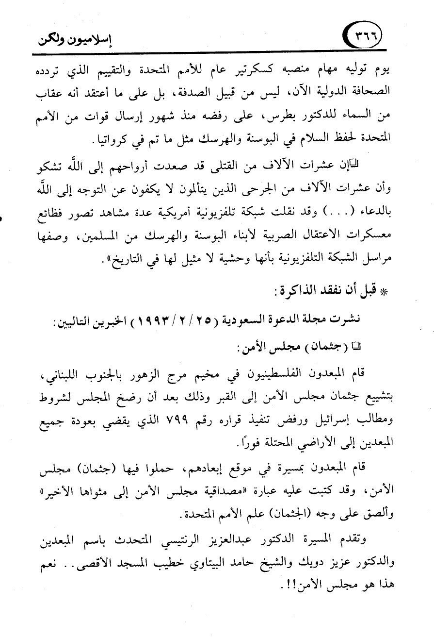 يوم توليه مهام منصبه كسكرتير عام للأمم المتحدة والتقييم الذي تردده الصحافة الدولية الآن، ليس من قبيل الصدفة، بل على ما أعتقد أنه عقاب من السماء للدكتور بطرس، على رفضه منذ شهور إرسال قوات من الأمم المتحدة لحفظ السلام في البوسنة والهرسك مثل ما تم في كرواتيا.