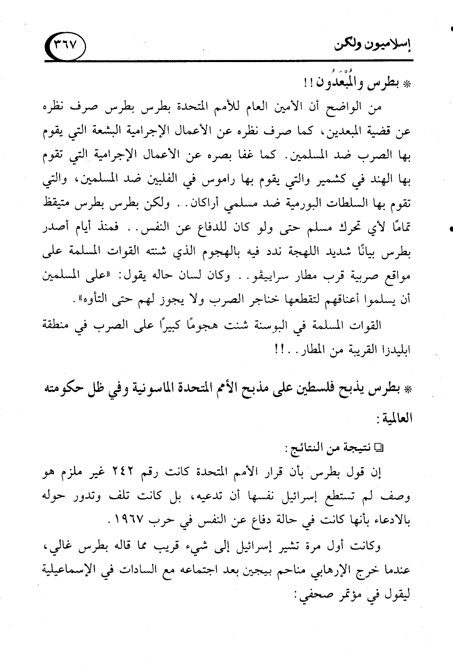 من الواضح أن الأمين العام للأمم المتحدة بطرس بطرس صرف نظره عن قضية المبعدين، كما صرف نظره عن الأعمال الإجرامية البشعة التي يقوم بها الصرب ضد المسلمين. كما غفا بصره عن الأعمال الإجرامية التي تقوم بها الهند في كشمير والتي يقوم بها راموس في الفلبين ضد المسلمين، والتي تقوم بها السلطات البورمية ضد مسلمي أركان .. ولكن بطرس بطرس متيقظ تمامًا لأي تحرك مسلم حتى ولو كان للدفاع عن النفس .. فمنذ أيام أصدر بطرس بيانًا شديد اللهجة ندد فيه بالهجوم الذي شنته القوات المسلمة على مواقع صربية قرب مطار سراييفو .. وكان لسان حاله يقول: "على المسلمين أن يسلموا أعناقهم لتقطعها خناجر الصرب ولا يجوز لهم حتى التأوه".