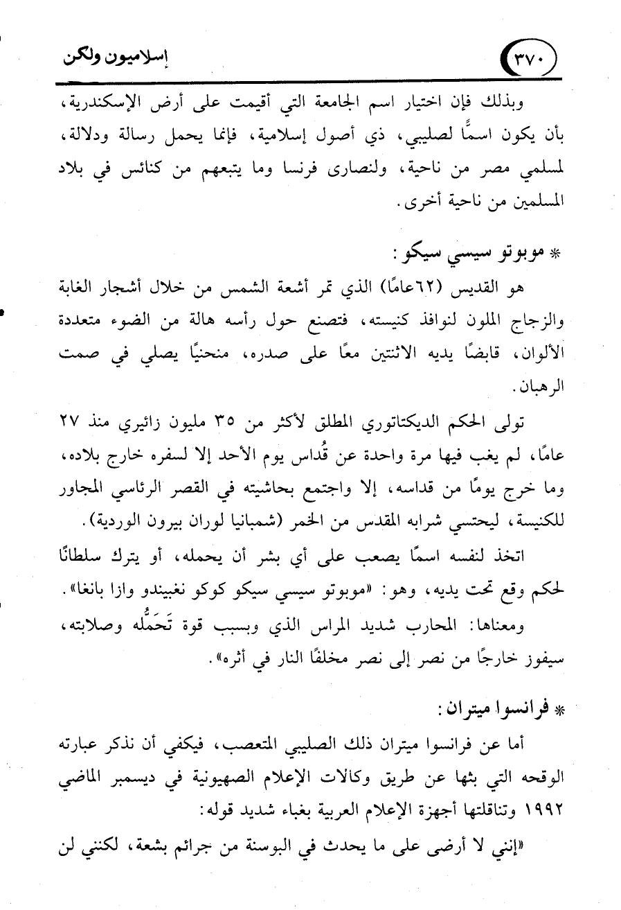 أما عن فرانسوا ميتران ذلك الصليبي المتعصب، فيكفي أن نذكر عبارته الوقحه التي بثها عن طريق وكالات الإعلام الصهيونية في ديسمبر الماضي 1992 وتناقلتها أجهزة الإعلام العربية بغباء شديد قوله: