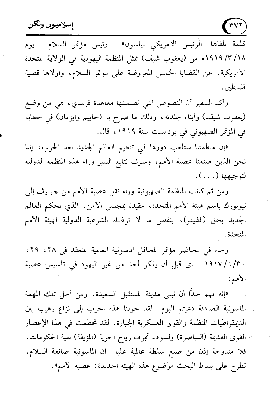 وأكد السفير أن النصوص التي تضمنتها معاهدة فرساي، هي من وضع (يعقوب شيف) وأبناء جلدته، وذلك ما صرح به (حاييم وايزمان) في خطابه في المؤتمر الصهيوني في بودابست سنة 1919، قال: