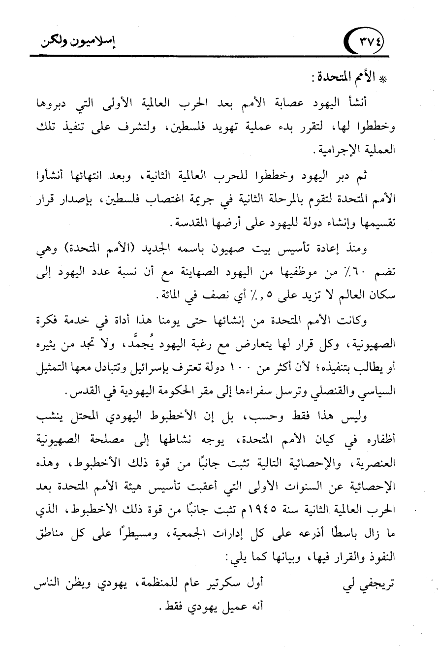 ثم دبر اليهود وخططوا للحرب العالمية الثانية، وبعد انتهائها أنشأوا الأمم المتحدة لتقوم بالمرحلة الثانية في جريمة اغتصاب فلسطين، بإصدار قرار تقسيمها وإنشاء دولة لليهود على أرضها المقدسة.