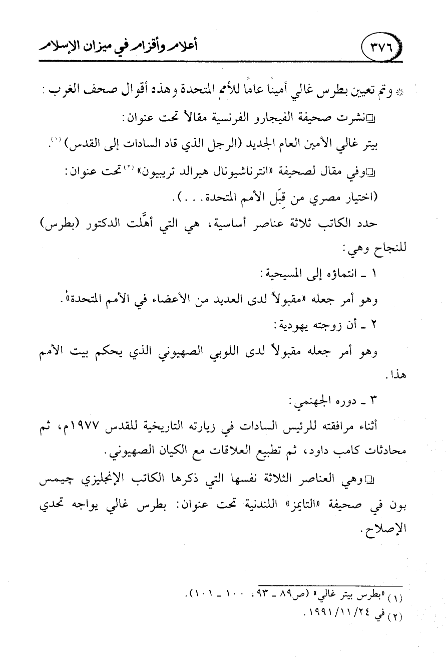 - وهي العناصر الثلاثة نفسها التي ذكرها الكاتب الإنجليزي جيمس بون في صحيفة "التايمز" اللندنية تحت عنوان: بطرس غالي يواجه تحدي الإصلاح.
