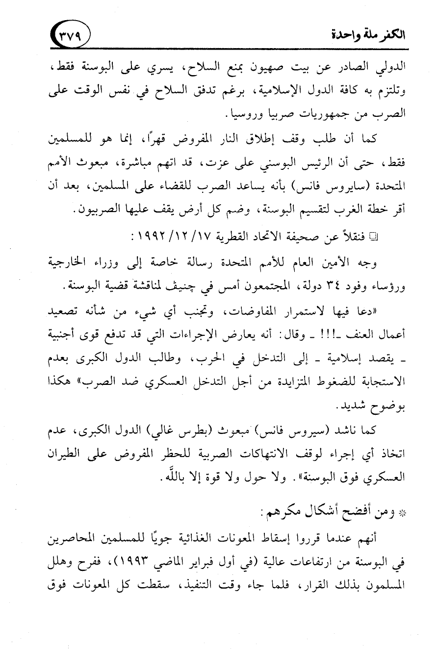 الدولي الصادر عن بيت صهيون بمنع السلاح، يسري على البوسنة فقط، وتلتزم به كافة الدول الإسلامية، برغم تدفق السلاح في نفس الوقت على الصرب من جمهوريات صربيا وروسيا.