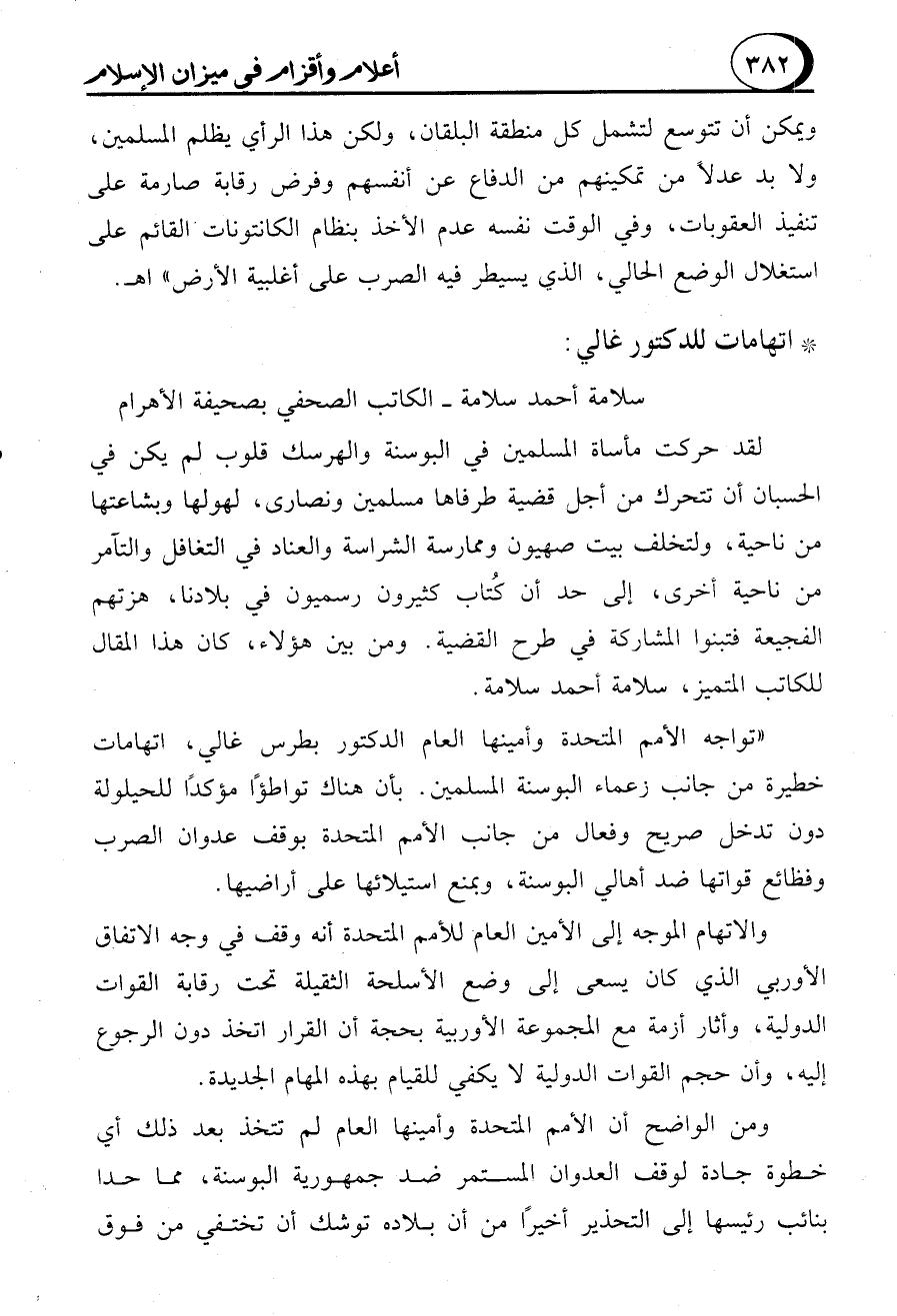 "تواجه الأمم المتحدة وأمينها العام الدكتور بطرس غالي، اتهامات خطيرة من جانب زعماء البوسنة المسلمين. بأن هناك تواطؤًا مؤكدًا للحيلولة دون تدخل صريح وفعال من جانب الأمم المتحدة بوقف عدوان الصرب وفظائع قواتها ضد أهالي البوسنة، وبمنع استيلائها على أراضيها.