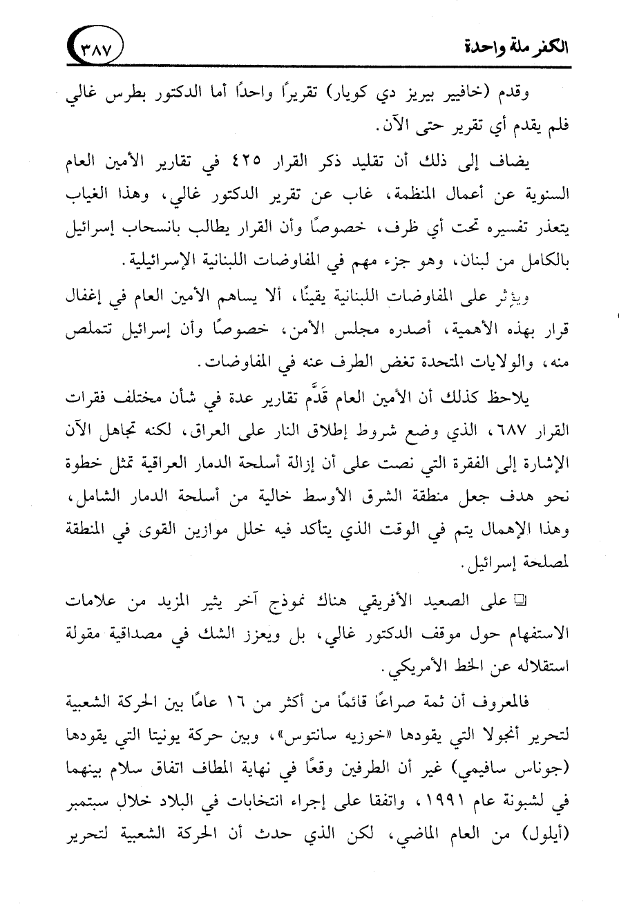 يضاف إلى ذلك أن تقليد ذكر القرار 425 في تقارير الأمين العام السنوية عن أعمال المنظمة، غاب عن تقرير الدكتور غالي، وهذا الغياب يتعذر تفسيره تحت أي ظرف، خصوصًا وأن القرار يطالب بانسحاب إسرائيل بالكامل من لبنان، وهو جزء مهم في المفاوضات اللبنانية الإسرائيلية.