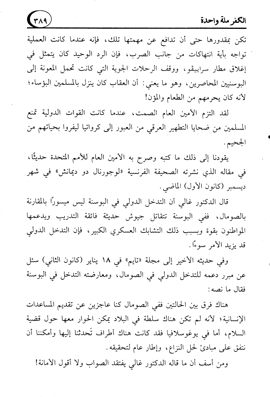 قال الدكتور غالي أن التدخل الدولي في البوسنة ليس ميسورًا بالمقارنة بالصومال، ففي البوسنة تتقاتل جيوش حديثة فائقة التدريب ويدعمها المواطنون بقوة وبسبب ذلك التشابك العسكري الكبير، فإن التدخل الدولي قد يزيد الأمر سوءًا.