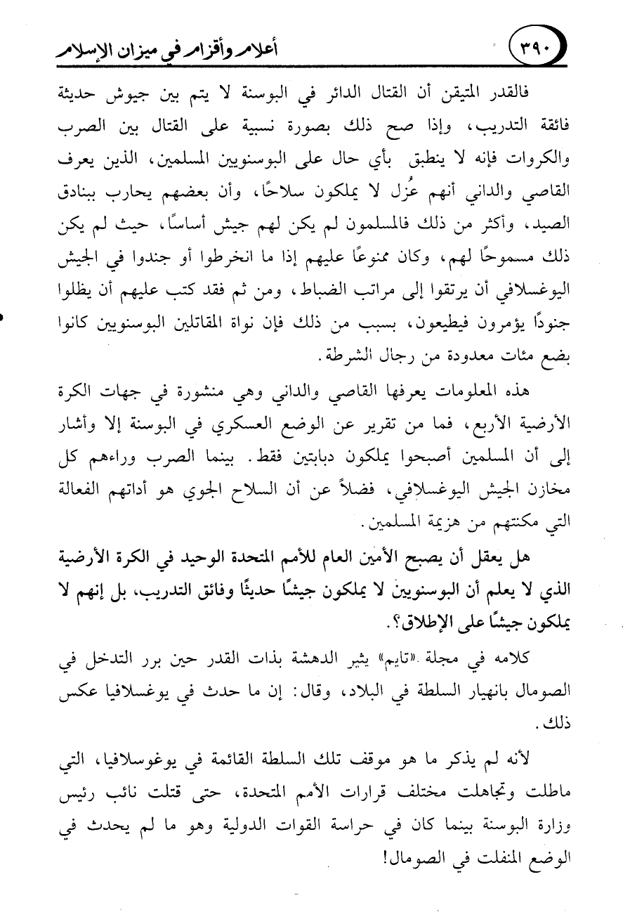 فالقدر المتيقن أن القتال الدائر في البوسنة لا يتم بين جيوش حديثة فائقة التدريب، وإذا صح ذلك بصورة نسبية على القتال بين الصرب والكروات فإنه لا ينطبق بأي حال على البوسنويين المسلمين، الذين يعرف القاصي والداني أنهم عُزل لا يملكون سلاحًا، وأن بعضهم يحارب ببنادق الصيد، وأكثر من ذلك فالمسلمون لم يكن لهم جيش أساسًا، حيث لم يكن ذلك مسموحًا لهم، وكان ممنوعًا عليهم إذا ما انخرطوا أو جندوا في الجيش اليوغسلافي أن يرتقوا إلى مراتب الضباط، ومن ثم فقد كتب عليهم أن يظلوا جنودًا يؤمرون فيطيعون، بسبب من ذلك فإن نواة المقاتلين البوسنويين كانوا بضع مئات معدودة من رجال الشرطة.