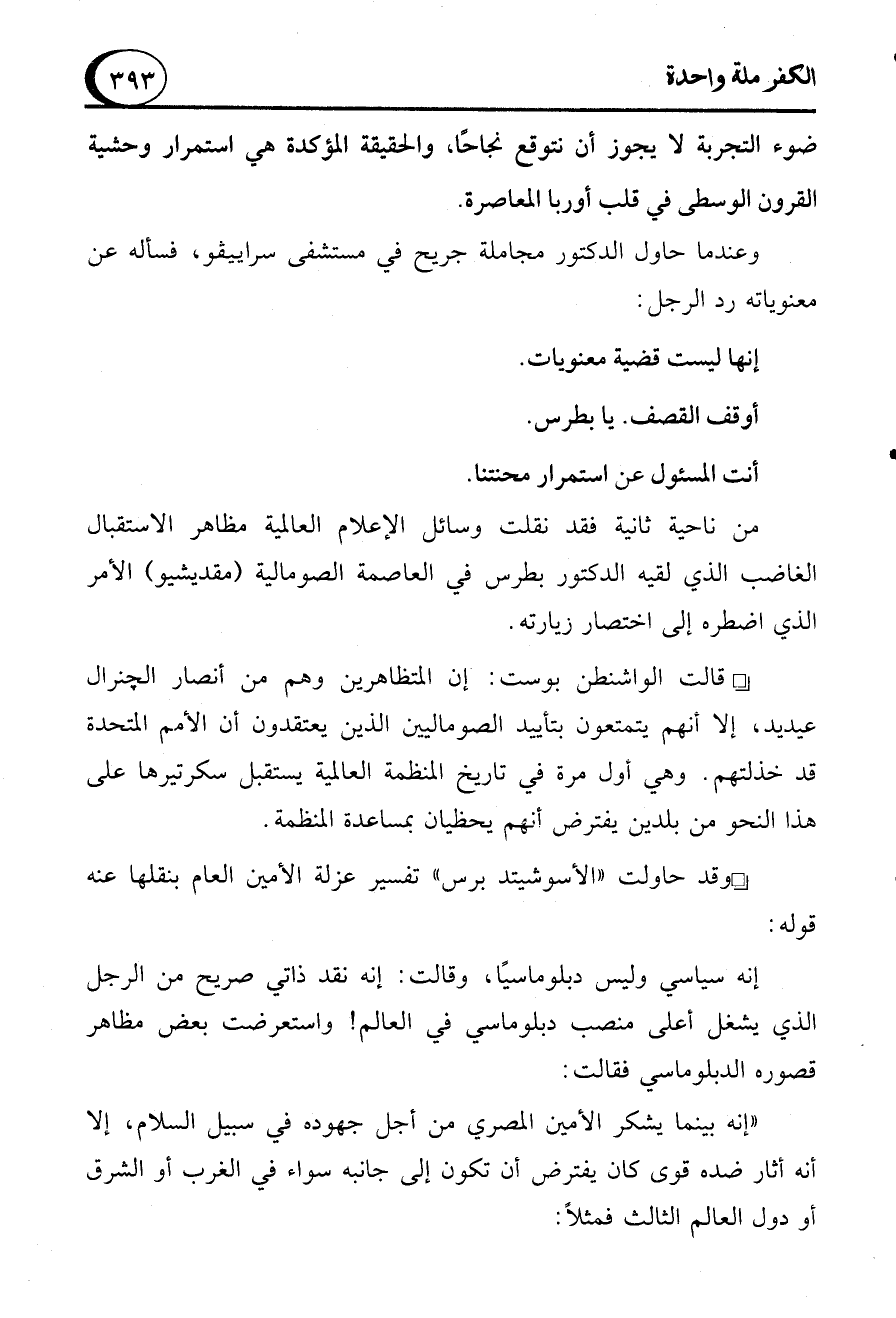 "إنه بينما يشكر الأمين المصري من أجل جهوده في سبيل السلام، إلا أنه أثار ضده قوى كان يفترض أن تكون إلى جانبه سواء في الغرب أو الشرق أو دول العالم الثالث فمثلاً: