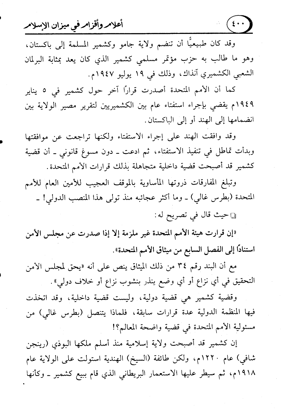 وقضية كشمير هي قضية دولية، وليست قضية داخلية، وقد اتخذت فيها المنظمة الدولية عدة قرارات سابقة، فلماذا يتنصل (بطرس غاني) من مسئولية الأمم المتحدة في قضية واضحة المعالم؟!
