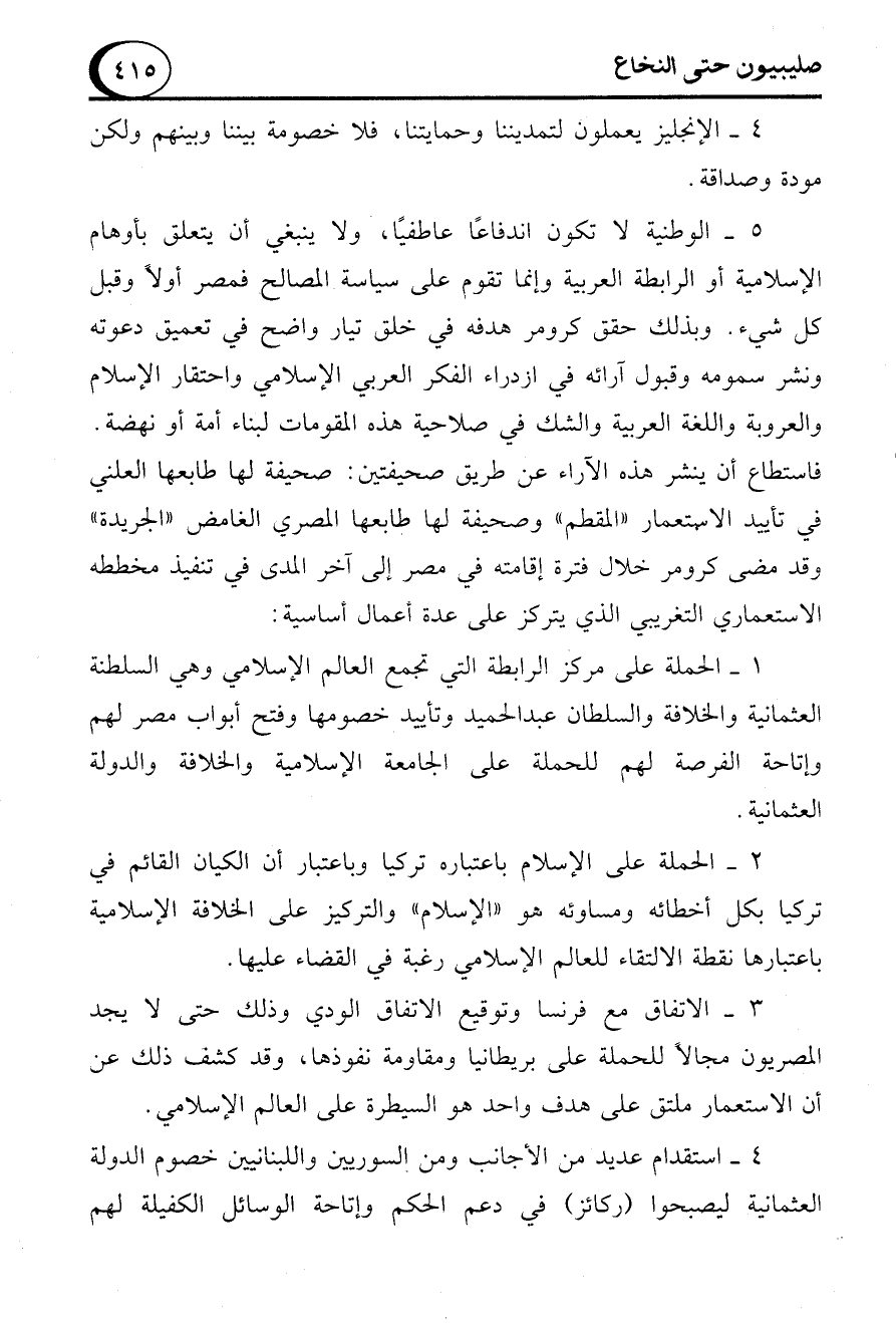 5 - الوطنية لا تكون اندفاعًا عاطفيًا، ولا ينبغي أن يتعلق بأوهام الإسلامية أو الرابطة العربية وإنما تقوم على سياسة المصالح فمصر أولاً وقبل كل شيء. وبذلك حقق كرومر هدفه في خلق تيار واضح في تعميق دعوته ونشر سمومه وقبول آرائه في ازدراء الفكر العربي الإسلامي واحتقار الإسلام والعروبة واللغة العربية والشك في صلاحية هذه المقومات لبناء أمة أو نهضة.