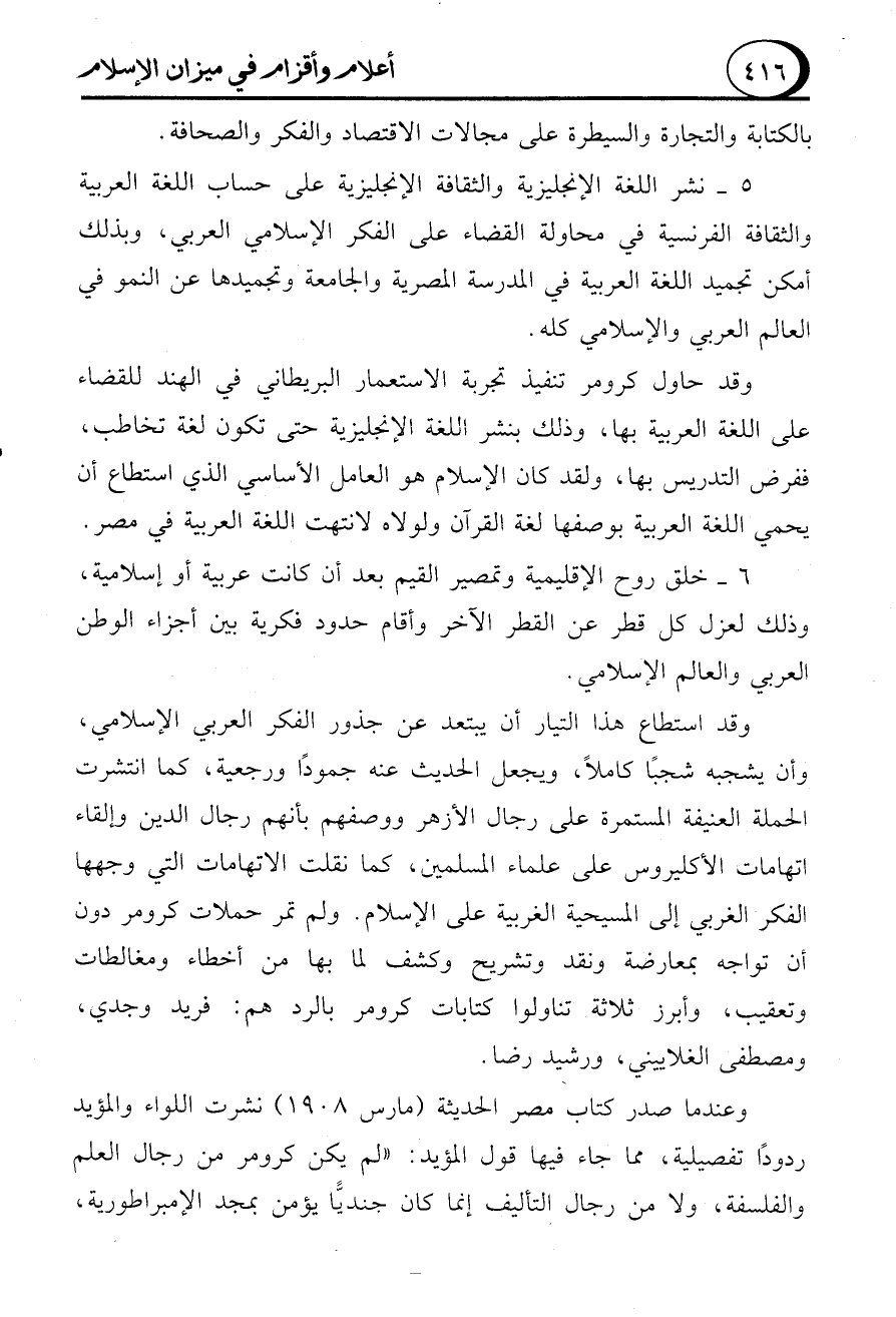 وقد استطاع هذا التيار أن يبتعد عن جذور الفكر العربي الإسلامي، وأن يشجبه شجبًا كاملاً، ويجعل الحديث عنه جمودًا ورجعية، كما انتشرت الحملة العنيفة المستمرة على رجال الأزهر ووصفهم بأنهم رجال الدين وإلقاء اتهامات الأكليروس على علماء المسلمين، كما نقلت الاتهامات التي وجهها الفكر الغربي إلى المسيحية الغربية على الإسلام. ولم تمر حملات كرومر دون أن تواجه بمعارضة ونقد وتشريح وكشف لما بها من أخطاء ومغالطات وتعقيب، وأبرز ثلاثة تناولوا كتابات كرومر بالرد هم: فريد وجدي، ومصطفى الغلاييني، ورشيد رضا.