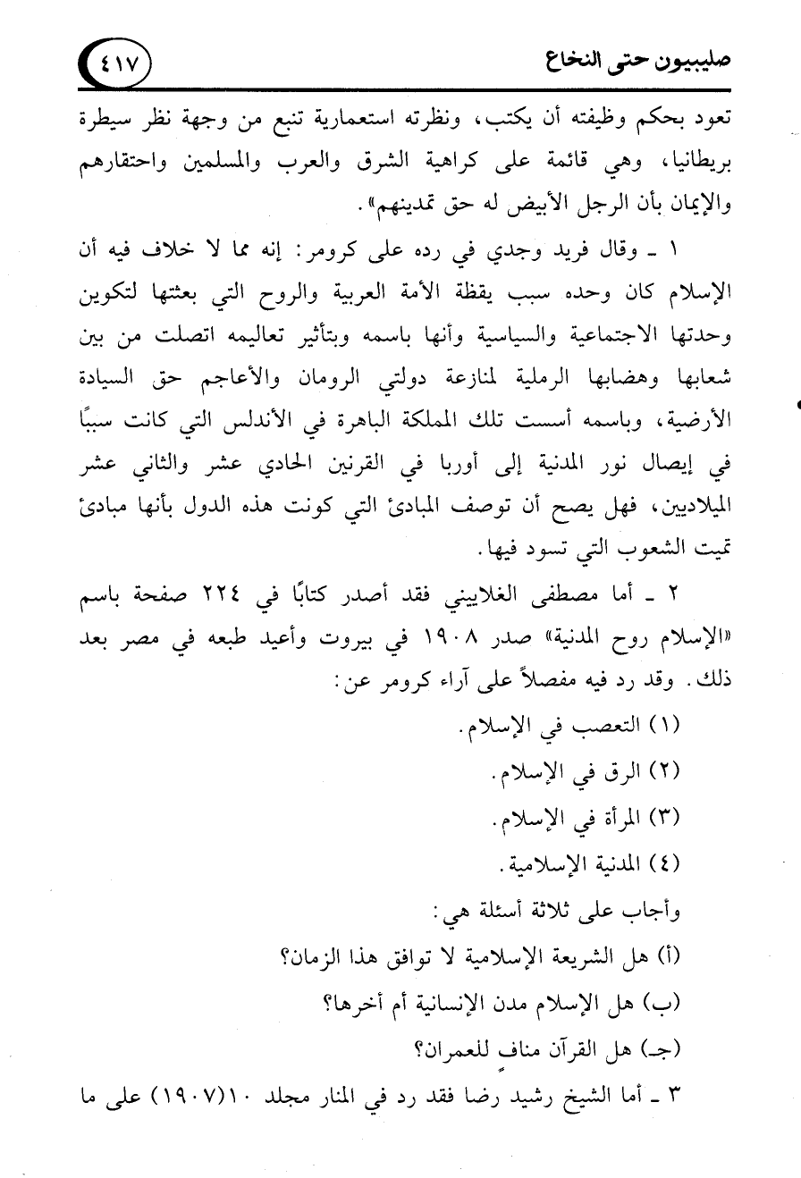 2 - أما مصطفى الغلاييني فقد أصدر كتابًا في 224 صفحة باسم "الإسلام روح المدنية" صدر 1908 في بيروت وأعيد طبعه في مصر بعد ذلك. وقد رد فيه مفصلاً على آراء كرومر عن: