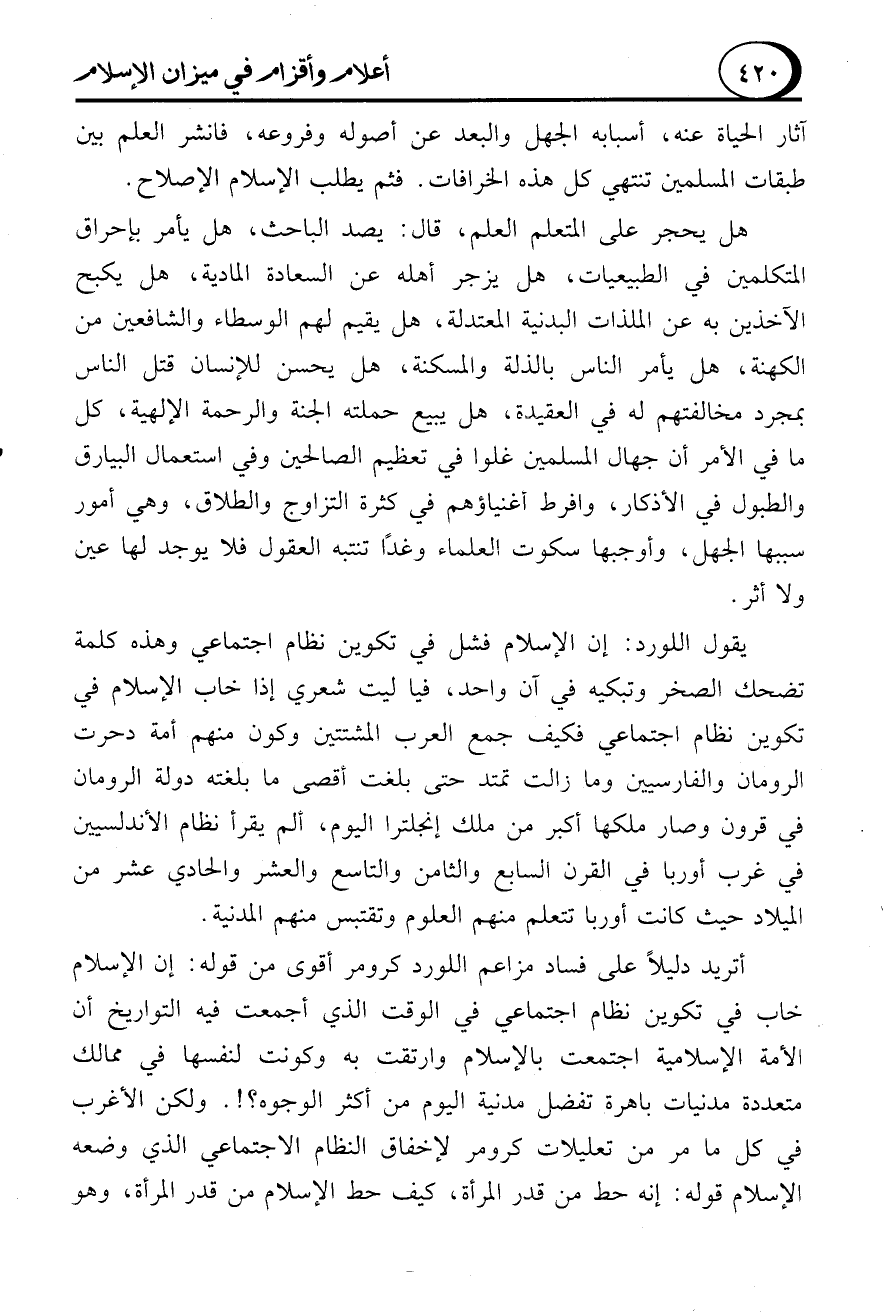 يقول اللورد: إن الإسلام فشل في تكوين نظام اجتماعي وهذه كلمة تضحك الصخر وتبكيه في آن واحد، فيا ليت شعري إذا خاب الإسلام في تكوين نظام اجتماعي فكيف جمع العرب المشتتين وكون منهم أمة دحرت الرومان والفارسيين وما زالت تمتد حتى بلغت أقصى ما بلغته دولة الرومان في قرون وصار ملكها أكبر من ملك إنجلترا اليوم، ألم يقرأ نظام الأندلسيين في غرب أوربا في القرن السابع والثامن والتاسع والعشر والحادي عشر من الميلاد حيث كانت أوربا تتعلم منهم العلوم وتقتبس منهم المدنية.