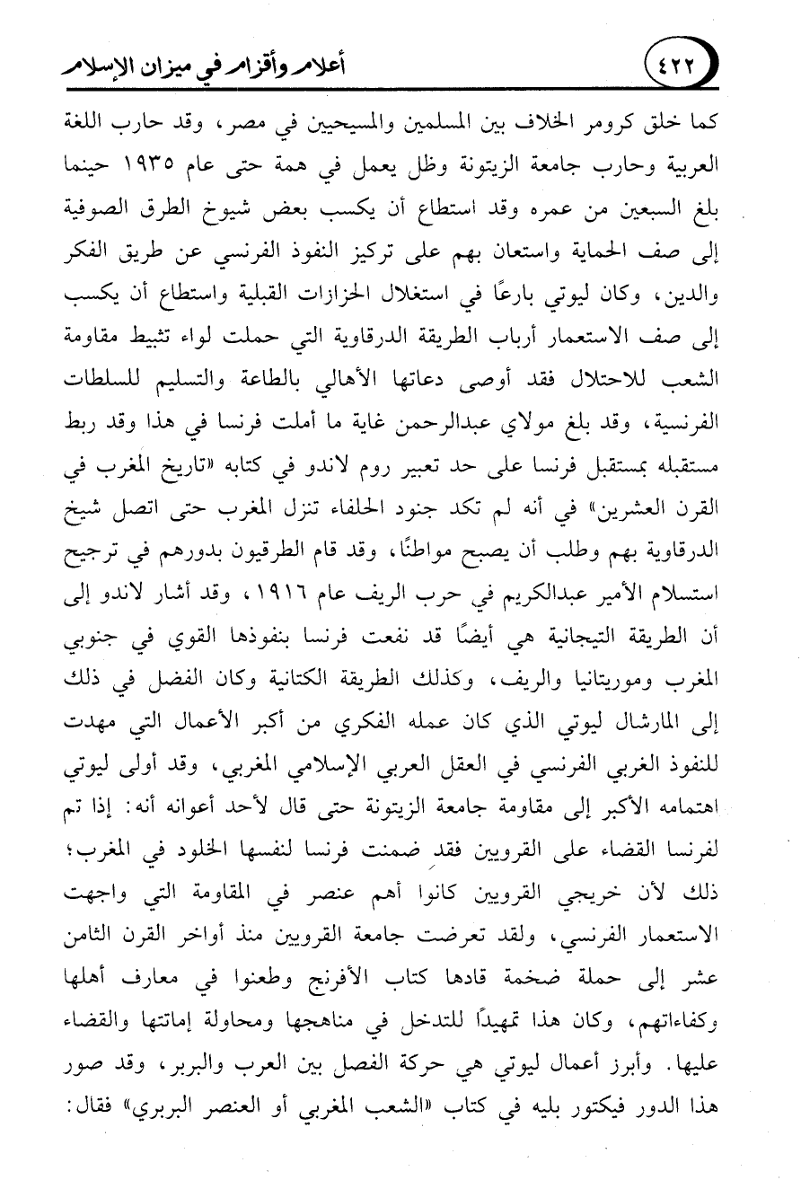 كما خلق كرومر الخلاف بين المسلمين والمسيحيين في مصر، وقد حارب اللغة العربية وحارب جامعة الزيتونة وظل يعمل في همة حتى عام 1935 حينما بلغ السبعين من عمره وقد استطاع أن يكسب بعض شيوخ الطرق الصوفية إلى صف الحماية واستعان بهم على تركيز النفوذ الفرنسي عن طريق الفكر والدين، وكان ليوتي بارعًا في استغلال الحزازات القبلية واستطاع أن يكسب إلى صف الاستعمار أرباب الطريقة الدرقاوية التي حملت لواء تثبيط مقاومة الشعب للاحتلال فقد أوصى دعاتها الأهالي بالطاعة والتسليم للسلطات الفرنسية، وقد بلغ مولاي عبد الرحمن غاية ما أملت فرنسا في هذا وقد ربط مستقبله بمستقبل فرنسا على حد تعبير روم لاندو في كتابه "تاريخ المغرب في القرن العشرين" في أنه لم تكد جنود الحلفاء تنزل المغرب حتى اتصل شيخ الدرقاوية بهم وطلب أن يصبح مواطنًا، وقد قام الطرقيون بدورهم في ترجيح استسلام الأمير عبد الكريم في حرب الريف عام 1916، وقد أشار لاندو إلى أن الطريقة التيجانية هي أيضًا قد نفعت فرنسا بنفوذها القوي في جنوبي المغرب وموريتانيا والريف، وكذلك الطريقة الكتانية وكان الفضل في ذلك إلى المارشال ليوتي الذي كان عمله الفكري من أكبر الأعمال التي مهدت للنفوذ الغربي الفرنسي في العقل العربي الإسلامي المغربي، وقد أولى ليوتي اهتمامه الأكبر إلى مقاومة جامعة الزيتونة حتى قال لأحد أعوانه أنه: إذا تم لفرنسا القضاء على القرويين فقد ضمنت فرنسا لنفسها الخلود في المغرب؛ ذلك لأن خريجي القرويين كانوا أهم عنصر في المقاومة التي واجهت الاستعمار الفرنسي، ولقد تعرضت جامعة القرويين منذ أواخر القرن الثامن عشر إلى حملة ضخمة قادها كتاب الأفرنج وطعنوا في معارف أهلها وكفاءاتهم، وكان هذا تمهيدًا للتدخل في مناهجها ومحاولة إماتتها والقضاء عليها. وأبرز أعمال ليوتي هي حركة الفصل بين العرب والبربر، وقد صور هذا الدور فيكتور بليه في كتاب "الشعب المغربي أو العنصر البربري" فقال: