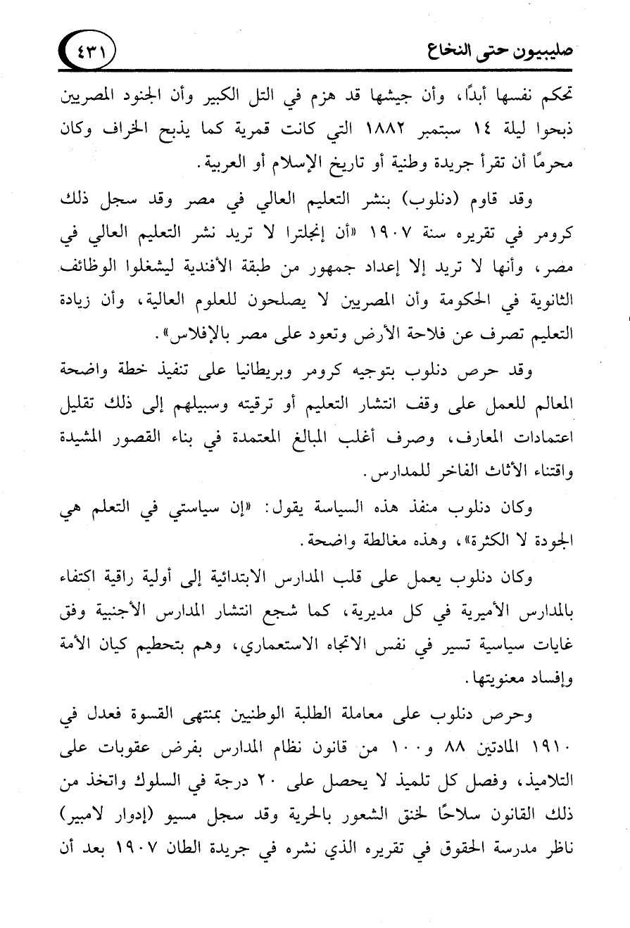 تحكم نفسها أبدًا، وأن جيشها قد هزم في التل الكبير وأن الجنود المصريين ذبحوا ليلة 14 سبتمبر 1882 التي كانت قمرية كما يذبح الخراف وكان محرمًا أن تقرأ جريدة وطنية أو تاريخ الإسلام أو العربية.