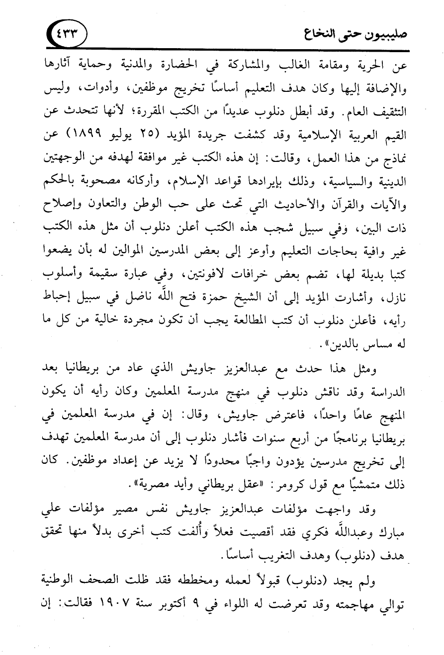 عن الحرية ومقامة الغالب والمشاركة في الحضارة والمدنية وحماية آثارها والإضافة إليها وكان هدف التعليم أساسًا تخريج موظفين، وأدوات، وليس التثقيف العام. وقد أبطل دنلوب عديدًا من الكتب المقررة؛ لأنها تتحدث عن القيم العربية الإسلامية وقد كشفت جريدة المؤيد (25 يوليو 1899) عن نماذج من هذا العمل، وقالت: إن هذه الكتب غير موافقة لهدفه من الوجهتين الدينية والسياسية، وذلك بإيرادها قواعد الإسلام، وأركانه مصحوبة بالحكم والآيات والقرآن والأحاديث التي تحث على حب الوطن والتعاون وإصلاح ذات البين، وفي سبيل شجب هذه الكتب أعلن دنلوب أن مثل هذه الكتب غير وافية بحاجات التعليم وأوعز إلى بعض المدرسين الموالين له بأن يضعوا كتبا بديلة لها، تضم بعض خرافات لافونتين، وفي عبارة سقيمة وأسلوب نازل، وأشارت المؤيد إلى أن الشيخ حمزة فتح الله ناضل في سبيل إحباط رأيه، فأعلن دنلوب أن كتب المطالعة يجب أن تكون مجردة خالية من كل ما له مساس بالدين".