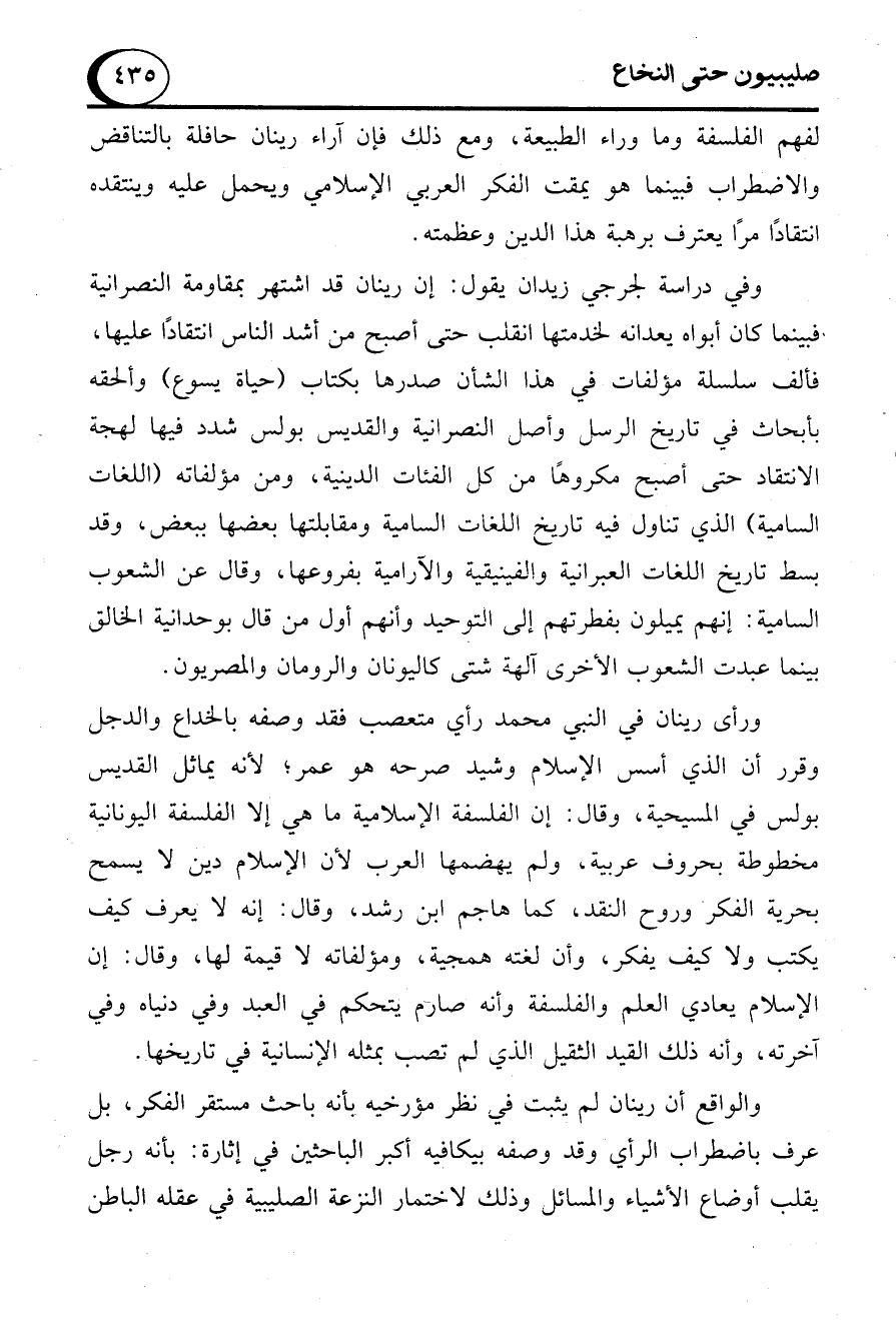 لفهم الفلسفة وما وراء الطبيعة، ومع ذلك فإن آراء رينان حافلة بالتناقض والاضطراب فبينما هو يمقت الفكر العربي الإسلامي ويحمل عليه وينتقده انتقادًا مرًا يعترف برهبة هذا الدين وعظمته.