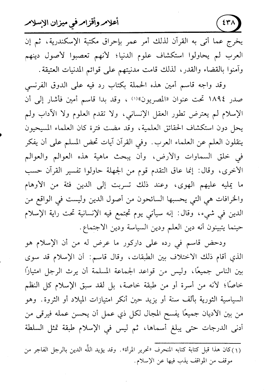 (1) كان هذا قبل كتابة كتابه المنحرف "تحرير المرأة". وقد يؤيد الله الدين بالرجل الفاجر من موقف من المواقف يذب فيها عن الإسلام.