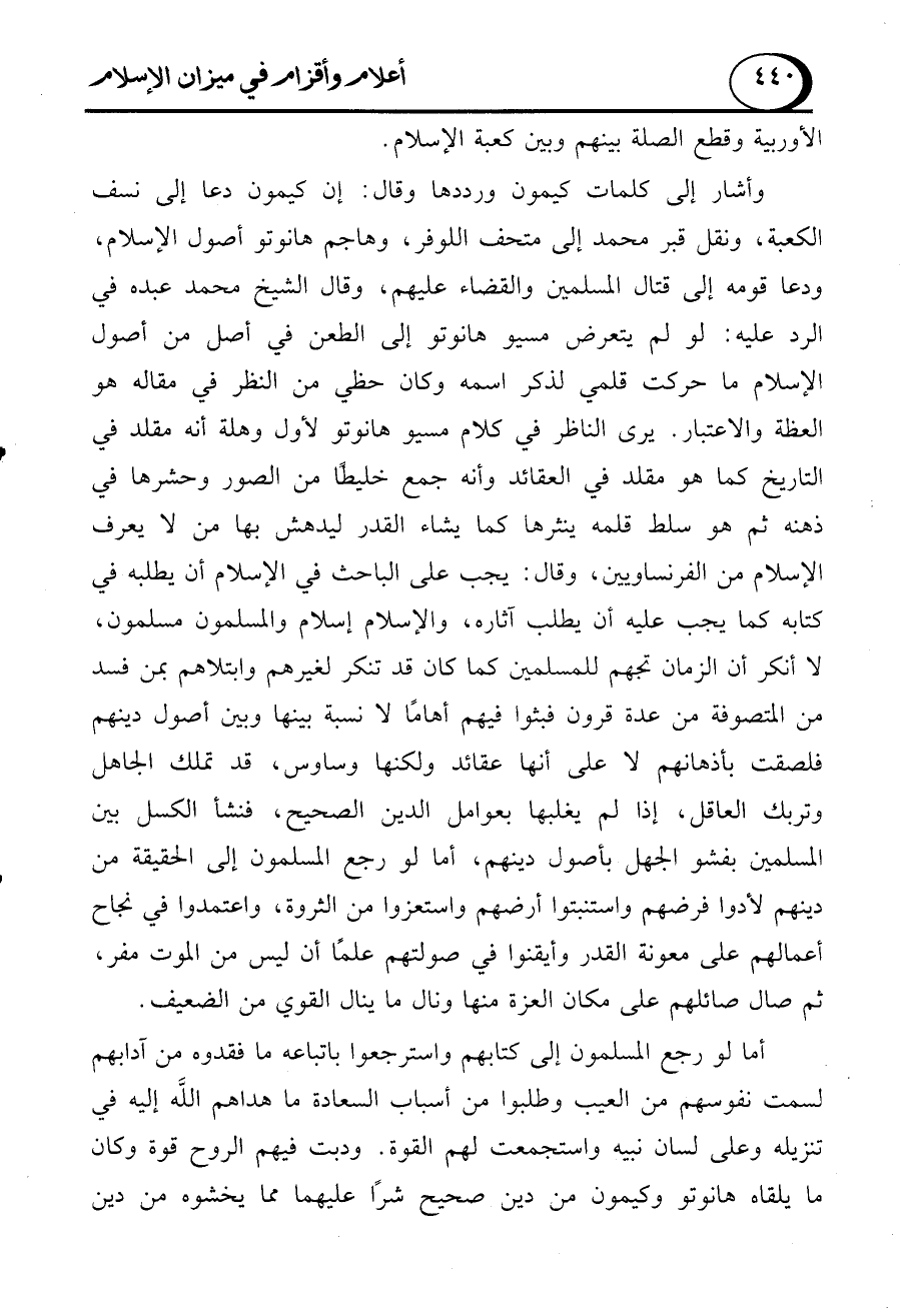 وأشار إلى كلمات كيمون ورددها وقال: إن كيمون دعا إلى نسف الكعبة، ونقل قبر محمد إلى متحف اللوفر، وهاجم هانوتو أصول الإسلام، ودعا قومه إلى قتال المسلمين والقضاء عليهم، وقال الشيخ محمد عبده في الرد عليه: لو لم يتعرض مسيو هانوتو إلى الطعن في أصل من أصول الإسلام ما حركت قلمي لذكر اسمه وكان حظي من النظر في مقاله هو العظة والاعتبار. يرى الناظر في كلام مسيو هانوتو لأول وهلة أنه مقلد في التاريخ كما هو مقلد في العقائد وأنه جمع خليطًا من الصور وحشرها في ذهنه ثم هو سلط قلمه ينثرها كما يشاء القدر ليدهش بها من لا يعرف الإسلام من الفرنساويين، وقال: يجب على الباحث في الإسلام أن يطلبه في كتابه كما يجب عليه أن يطلب آثاره، والإسلام إسلام والمسلمون مسلمون، لا أنكر أن الزمان تجهم للمسلمين كما كان قد تنكر لغيرهم وابتلاهم بمن فسد من المتصوفة من عدة قرون فبثوا فيهم أهامًا لا نسبة بينها وبين أصول دينهم فلصقت بأذهانهم لا على أنها عقائد ولكنها وساوس، قد تملك الجاهل وتربك العاقل، إذا لم يغلبها بعوامل الدين الصحيح، فنشأ الكسل بين المسلمين بفشو الجهل بأصول دينهم، أما لو رجع المسلمون إلى الحقيقة من دينهم لأدوا فرضهم واستنبتوا أرضهم واستعزوا من الثروة، واعتمدوا في نجاح أعمالهم على معونة القدر وأيقنوا في صولتهم علمًا أن ليس من الموت مفر، ثم صال صائلهم على مكان العزة منها ونال ما ينال القوي من الضعيف.