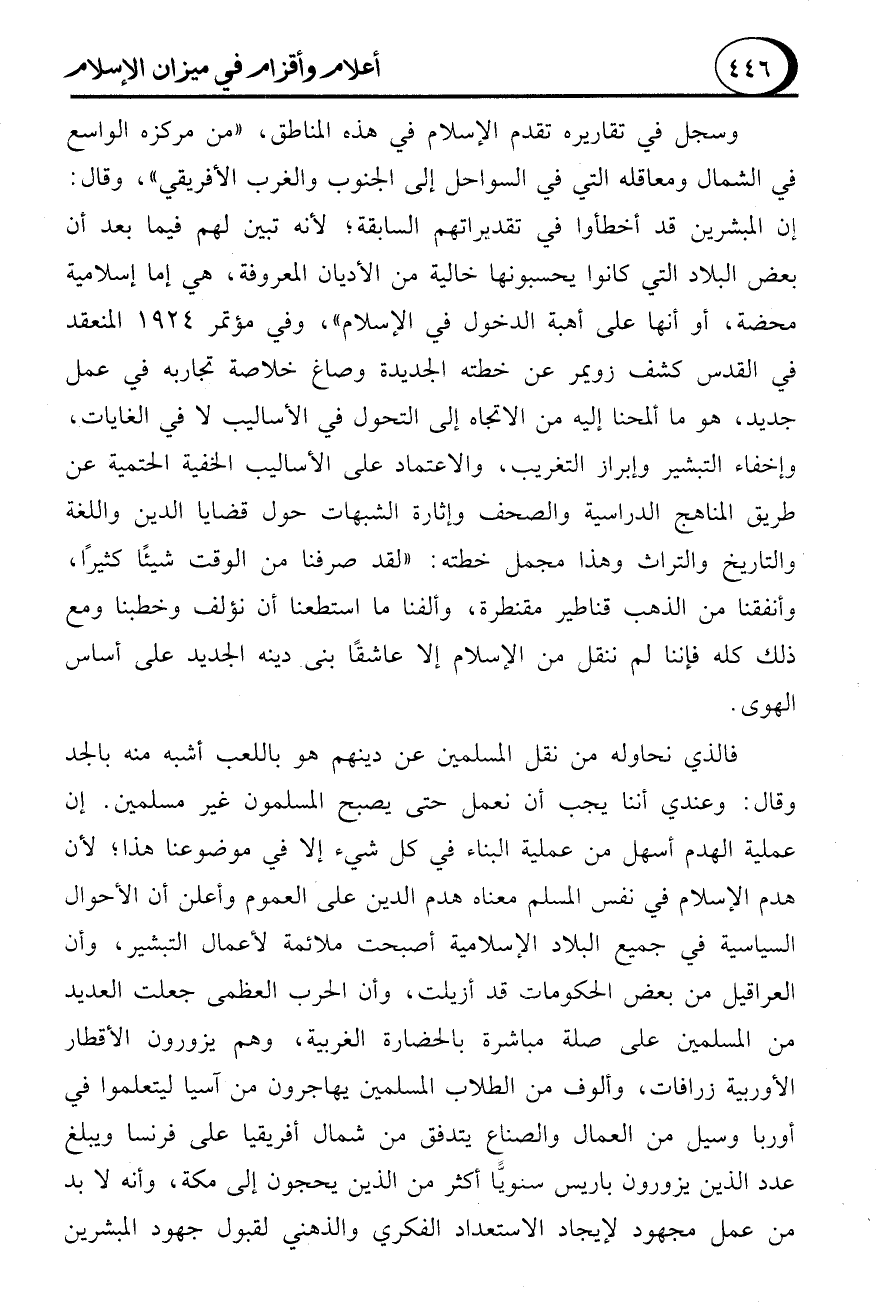 فالذي نحاوله من نقل المسلمين عن دينهم هو باللعب أشبه منه بالجد وقال: وعندي أننا يجب أن نعمل حتى يصبح المسلمون غير مسلمين. إن عملية الهدم أسهل من عملية البناء في كل شيء إلا في موضوعنا هذا؛ لأن هدم الإسلام في نفس المسلم معناه هدم الدين على العموم وأعلن أن الأحوال السياسية في جميع البلاد الإسلامية أصبحت ملائمة لأعمال التبشير، وأن العراقيل من بعض الحكومات قد أزيلت، وأن الحرب العظمى جعلت العديد من المسلمين على صلة مباشرة بالحضارة الغربية، وهم يزورون الأقطار الأوربية زرافات، وألوف من الطلاب المسلمين يهاجرون من آسيا ليتعلموا في أوربا وسيل من العمال والصناع يتدفق من شمال أفريقيا على فرنسا ويبلغ عدد الذين يزورون باريس سنويًّا أكثر من الذين يحجون إلى مكة، وأنه لا بد من عمل مجهود لإيجاد الاستعداد الفكري والذهني لقبول جهود المبشرين