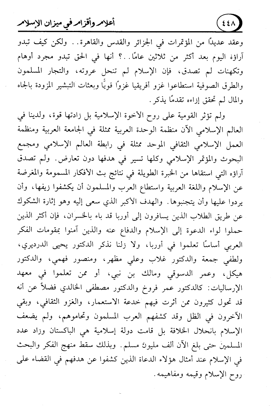 ولم تؤثر القومية على روح الأخوة الإسلامية بل زادتها قوة، ولدينا في العالم الإسلامي الآن منظمة الوحدة العربية ممثلة في الجامعة العربية ومنظمة العمل الإسلامي الثقافي الموحد ممثلة في رابطة العالم الإسلامي ومجمع البحوث والمؤتمر الإسلامي وكلها تسير في هدفها دون تعارض. ولم تصدق آراؤه التي استقاها من الخبرة الطويلة في نتائج بث الأفكار المسمومة والمغرضة عن الإسلام واللغة العربية واستطاع العرب والمسلمون أن يكشفوا زيفها، وأن يردوا عليها وأن يتجنبوها. والهدف الأكبر الذي سعى إليه وهو إثارة الشكوك عن طريق الطلاب الذين يسافرون إلى أوربا قد باء بالخسران، فإن أكثر الذين حملوا لواء الدعوة إلى الإسلام والدفاع عنه والذين آمنوا بمقومات الفكر العربي أساسًا تعلموا في أوربا، ولا زلنا نذكر الدكتور يحيى الدرديري، ولطفي جمعة والدكتور غلاب وعلي مظهر، ومنصور فهمي، والدكتور هيكل، وعمر الدسوقي ومالك بن نبي، أو ممن تعلموا في معهد الإرساليات: كالدكتور عمر فروخ والدكتور مصطفى الخالدي فضلاً عن أنه قد تحول كثيرون ممن أثرت فيهم خدعة الاستعمار، والغزو الثقافي، وبقي الآخرون في الظل وقد كشفهم العرب المسلمون وتحاموهم، ولم يضعف الإسلام بانحلال الخلافة بل قامت دولة إسلامية هي الباكستان وزاد عدد المسلمين حتى بلغ الآن ألف مليون مسلم. وبذلك سقط منهج الفكر والبحث في الإسلام عند أمثال هؤلاء الدعاة الذين كشفوا عن هدفهم في القضاء على روح الإسلام وقيمه ومفاهيمه.