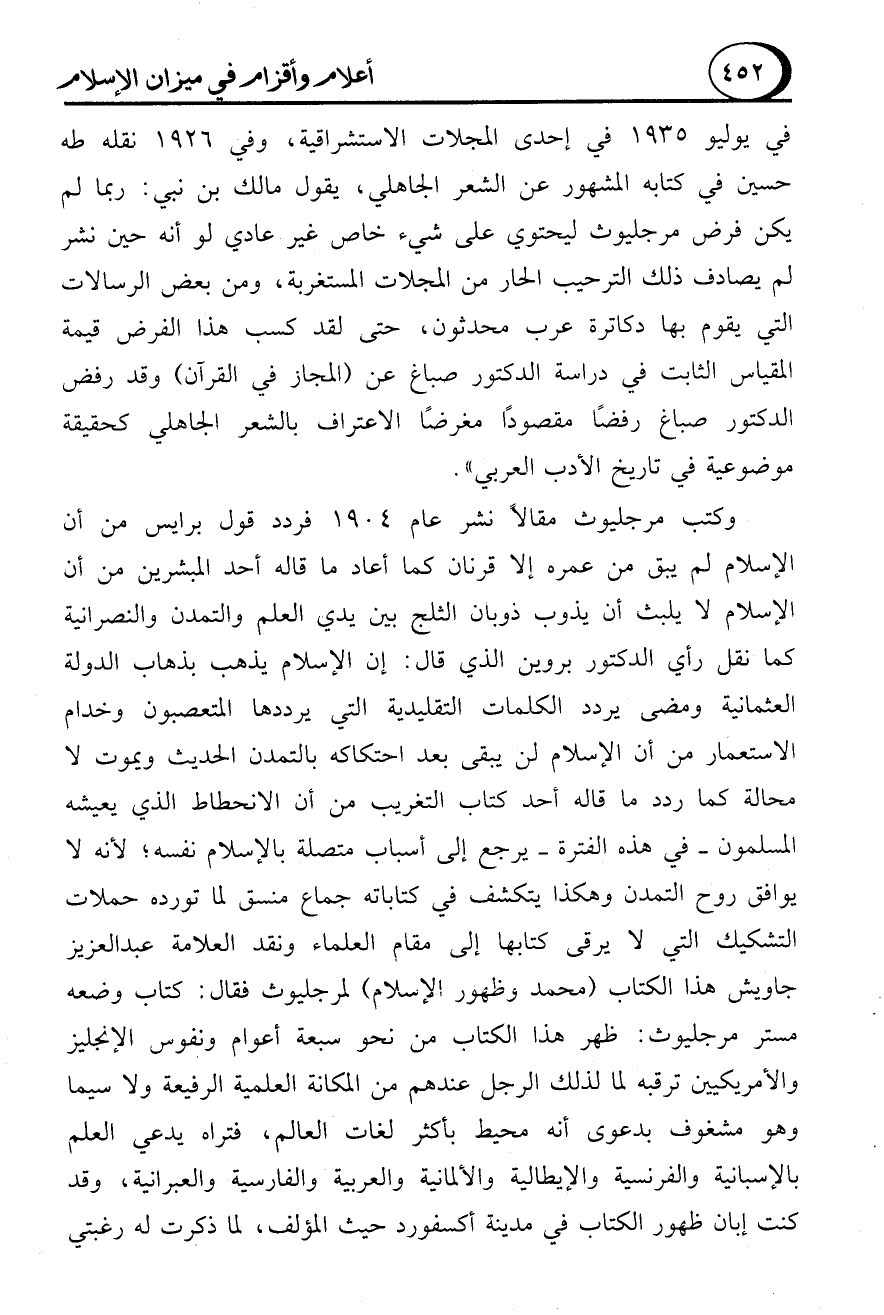 وكتب مرجليوث مقالاً نشر عام 1904 فردد قول برايس من أن الإسلام لم يبق من عمره إلا قرنان كما أعاد ما قاله أحد المبشرين من أن الإسلام لا يلبث أن يذوب ذوبان الثلج بين يدي العلم والتمدن والنصرانية كما نقل رأي الدكتور بروين الذي قال": إن الإسلام يذهب بذهاب الدولة العثمانية ومضى يردد الكلمات التقليدية التي يرددها المتعصبون وخدام الاستعمار من أن الإسلام لن يبقى بعد احتكاكه بالتمدن الحديث ويموت لا محالة كما ردد ما قاله أحد كتاب التغريب من أن الانحطاط الذي يعيشه المسلمون -في هذه الفترة- يرجع إلى أسباب متصلة بالإسلام نفسه؛ لأنه لا يوافق روح التمدن وهكذا يتكشف في كتاباته جماع منسق لما تورده حملات التشكيك التي لا يرقى كتابها إلى مقام العلماء ونقد العلامة عبد العزيز جاويش هذا الكتاب (محمد وظهور الإسلام) لمرجليوث فقال: كتاب وضعه مستر مرجليوث: ظهر هذا الكتاب من نحو سبعة أعوام ونفوس الإنجليز والأمريكيين ترقبه لما لذلك الرجل عندهم من المكانة العلمية الرفيعة ولا سيما وهو مشغوف بدعوى أنه محيط بأكثر لغات العالم، فتراه يدعي العلم بالإسبانية والفرنسية والإيطالية والألمانية والعربية والفارسية والعبرانية، وقد كنت إبان ظهور الكتاب في مدينة أكسفورد حيث المؤلف، لما ذكرت له رغبتي