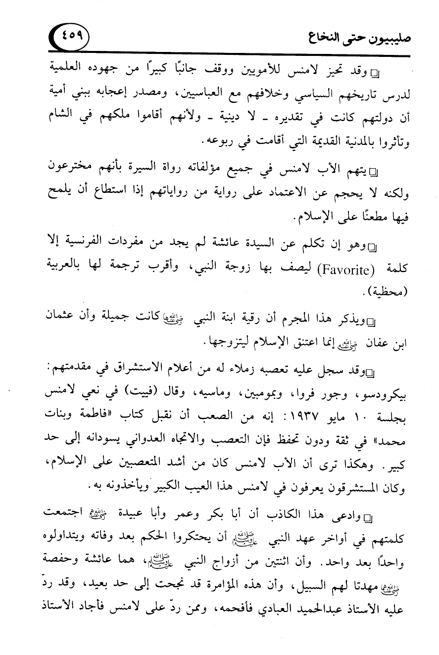 - وهو إن تكلم عن السيدة عائشة لم يجد من مفردات الفرنسية إلا كلمة (Favorite) ليصف بها زوجة النبي، وأقرب ترجمة لها بالعربية (محظية).