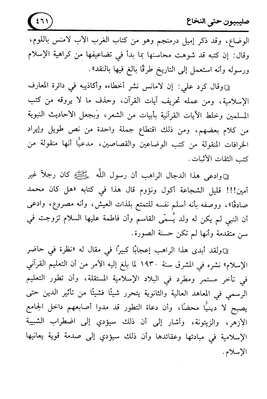 - وادعى هذا الدجال الراهب أن رسول الله - صلى الله عليه وسلم - كان رجلاً غير أمين!!! قليل الشجاعة أكول ونؤوم قال هذا في كتابه "هل كان محمد صادقًا"، ووصفه بأنه أسلم نفسه للتمتع بلذات العيش، وأنه مصروع، وادعى أن النبي لم يكن له ولد يُسمّى القاسم وأن فاطمة عليها السلام تزوجت في سن متقدمة وأنها لم تكن حسنة الصورة.
