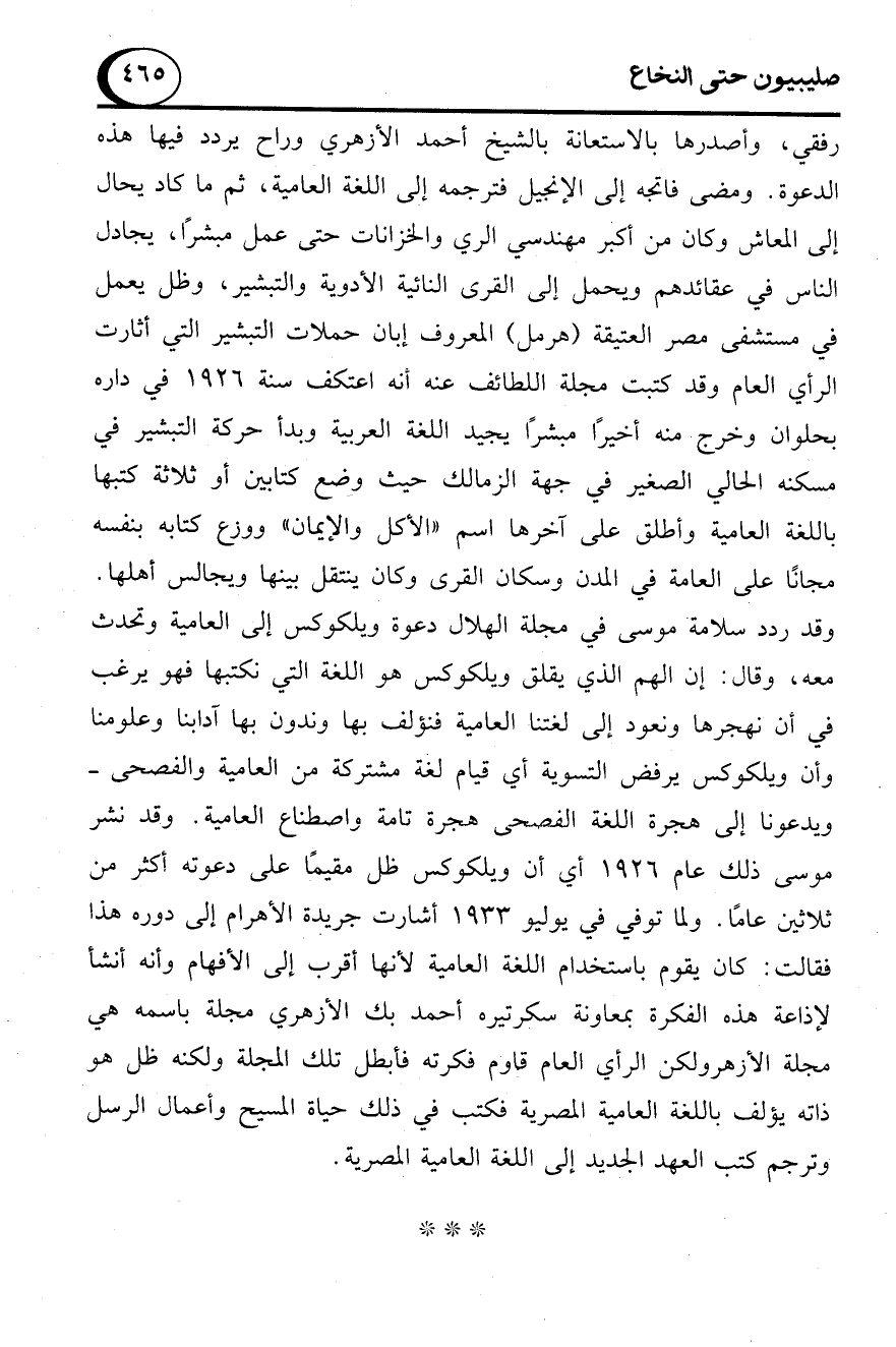 وقد ردد سلامة موسى في مجلة الهلال دعوة ويلكوكس إلى العامية وتحدث معه، وقال: إن الهم الذي يقلق ويلكوكس هو اللغة التي نكتبها فهو يرغب في أن نهجرها ونعود إلى لغتنا العامية فنؤلف بها وندون بها آدابنا وعلومنا وأن ويلكوكس يرفض التسوية أي قيام لغة مشتركة من العامية والفصحى - ويدعونا إلى هجرة اللغة الفصحى هجرة تامة واصطناع العامية. وقد نشر موسى ذلك عام 1926 أي أن ويلكوكس ظل مقيمًا على دعوته أكثر من ثلاثين عامًا. ولما توفي في يوليو 1933 أشارت جريدة الأهرام إلى دوره هذا فقالت: كان يقوم باستخدام اللغة العامية لأنها أقرب إلى الأفهام وأنه أنشأ لإذاعة هذه الفكرة بمعاونة سكرتيره أحمد بك الأزهري مجلة باسمه في مجلة الأزهر ولكن الرأي العام قاوم فكرته فأبطل تلك المجلة ولكنه ظل هو ذاته يؤلف باللغة العامية المصرية فكتب في ذلك حياة المسيح وأعمال الرسل وترجم كتب العهد الجديد إلى اللغة العامية المصرية.