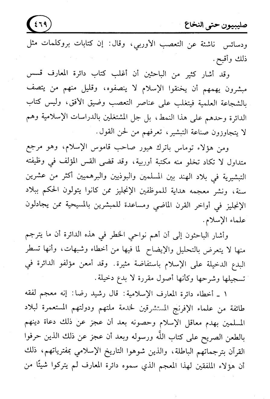 1 - أخطاء دائرة المعارف الإسلامية: قال رشيد رضا: إنه معجم لفقه طائفة من علماء الإفرنج المستشرقين لخدمة ملتهم ودولتهم المستعمرة لبلاد المسلمين بهدم معاقل الإسلام وحصونه بعد أن عجز عن ذلك دعاة دينهم بالطعن الصريح على كتاب الله ورسوله وبعد أن عجز عن ذلك الذين حرفوا القرآن بترجماتهم الباطلة، والذين شوهوا التاريخ الإسلامي بمفترياتهم، ذلك أن هؤلاء الملفقين لهذا المعجم الذي سموه دائرة المعارف لم يتركوا شيئًا من