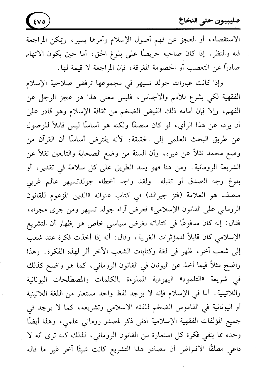 وإذا كانت عبارات جولد تسيهر في مجموعها ترفض صلاحية الإسلام الفقهية لكي يشرع للأمم والأجناس، فليس معنى هذا هو عجز الرجل عن الفهم، وإلا فإن أمامه ذلك الفيض الضخم من ثقافة الإسلام وهو قادر على أن يرده عن هذا الرأي، لو كان منصفًا ولكنه هو أساسًا ليس قابلاً للوصول عن طريق البحث العلمي إلى الحقيقة؛ لأنه يفترض أساسًا أن القرآن من وضع محمد نقلاً عن غيره، وأن السنة من وضع الصحابة والتابعين نقلاً عن الشريعة الرومانية. ومن هنا فهو يسد الطريق على كل سلامة في تقدير، أو بلوغ وجه الصدق أو تقبله. ولقد واجه أخطاء جولدتسيهر عالم غربي منصف هو العلامة (فتز جيرالد) في كتاب عنوانه "الدين المزعوم للقانون الروماني على القانون الإسلامي" فعرض آراء جولد تسيهر ومن جرى مجراه، فقال: إنه كان مدفوعًا في كتاباته بغرض سياسي خاص هو إظهار أن التشريع الإسلامي كان قابلاً للمؤثرات الغربية، وقال: أنه إذا أخذت فكرة عند شعب إلى شعب آخر، ظهر في لغة وكتابات الشعب الآخر أثر لهذه الفكرة. وهذا واضح مثلاً فيما أخذ عن اليونان في القانون الروماني، كما هو واضح كذلك في شريعة "التلمود" اليهودية المملوءة بالكلمات والمصطلحات اليونانية واللاتينية. أما في الإسلام فإنه لا يوجد لفظ واحد مستعار من اللغة اللاتينية أو اليونانية في القاموس الضخم للفقة الإسلامي وتشريعه، كما لا يوجد في جميع المؤلفات الفقهية الإسلامية أدنى ذكر لمصدر روماني علمي، وهذا أيضًا وحده مما ينفي فكرة كل استعارة من القانون الروماني، لذلك كله ترى أنه لا داعي مطلقًا الافتراض أن مصادر هذا التشريع كانت شيئًا آخر غير ما قاله