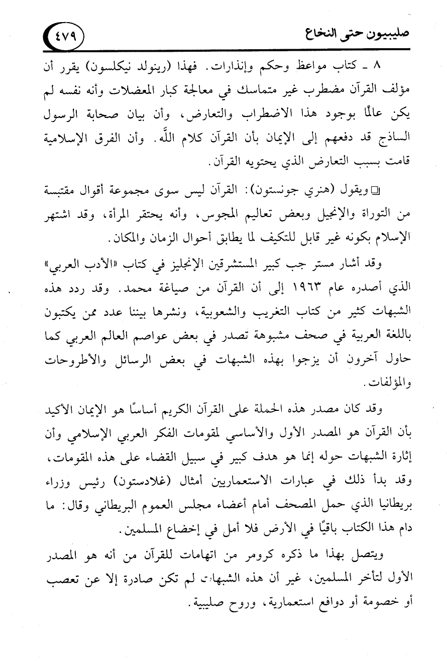 8 - كتاب مواعظ وحكم وإنذارات. فهذا (رينولد نيكلسون) يقرر أن مؤلف القرآن مضطرب غير متماسك في معالجة كبار المعضلات وأنه نفسه لم يكن عالمًا بوجود هذا الاضطراب والتعارض، وأن بيان صحابة الرسول الساذج قد دفعهم إلى الإيمان بأن القرآن كلام الله. وأن الفرق الإسلامية قامت بسبب التعارض الذي يحتويه القرآن.