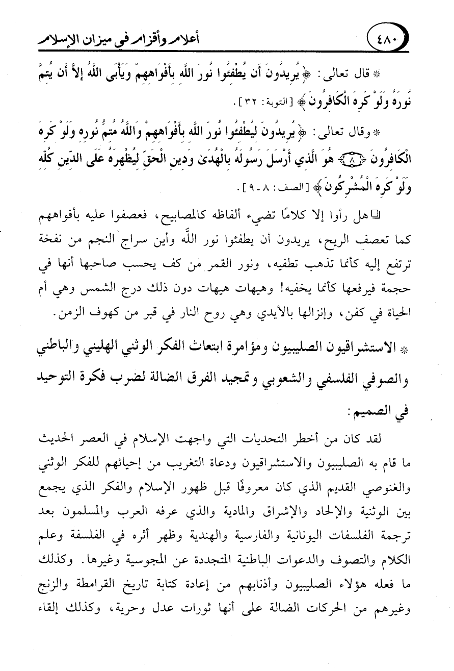 * وقال تعالى: {يُرِيدُونَ لِيُطْفِئُوا نُورَ اللهِ بِأَفْوَاهِهِمْ وَاللهُ مُتِمُّ نُورِهِ وَلَوْ كَرِهَ الْكَافِرُونَ (8) هُوَ الَّذِي أَرْسَلَ رَسُولَهُ بِالْهُدَى وَدِينِ الْحَقِّ لِيُظْهِرَهُ عَلَى الدِّينِ كُلِّهِ وَلَوْ كَرِهَ الْمُشْرِكُونَ} [الصف: 8 - 9].