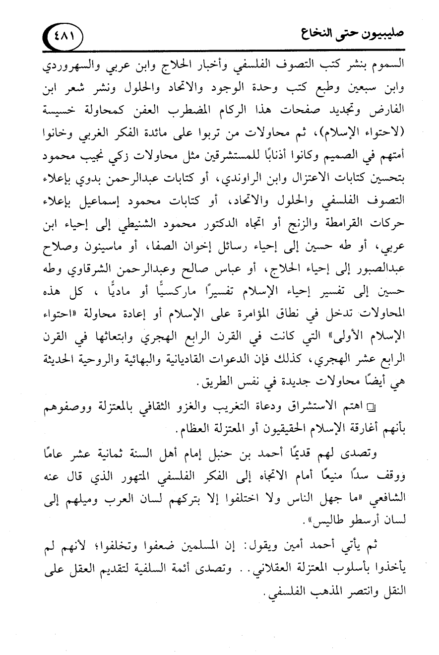 السموم بنشر كتب التصوف الفلسفي وأخبار الحلاج وابن عربي والسهروردي وابن سبعين وطبع كتب وحدة الوجود والاتحاد والحلول ونشر شعر ابن الفارض وتجديد صفحات هذا الركام المضطرب العفن كمحاولة خسيسة (لاحتواء الإسلام)، ثم محاولات من تربوا على مائدة الفكر الغربي وخانوا أمتهم في الصميم وكانوا أذنابًا للمستشرقين مثل محاولات زكي نجيب محمود بتحسين كتابات الاعتزال وابن الراوندي، أو كتابات عبد الرحمن بدوي بإعلاء التصوف الفلسفي والحلول والاتحاد، أو كتابات محمود إسماعيل بإعلاء حركات القرامطة والزنج أو اتجاه الدكتور محمود الشنيطي إلى إحياء ابن عربي، أو طه حسين إلى إحياء رسائل إخوان الصفا، أو ماسينون وصلاح عبد الصبور إلى إحياء الحلاج، أو عباس صالح وعبد الرحمن الشرقاوي وطه حسين إلى تفسير إحياء الإسلام تفسيرًا ماركسيًّا أو ماديًّا، كل هذه المحاولات تدخل في نطاق المؤامرة على الإسلام أو إعادة محاولة "احتواء الإسلام الأولى" التي كانت في القرن الرابع الهجري وابتعاثها في القرن الرابع عشر الهجري، كذلك فإن الدعوات القاديانية والبهائية والروحية الحديثة هي أيضًا محاولات جديدة في نفس الطريق.