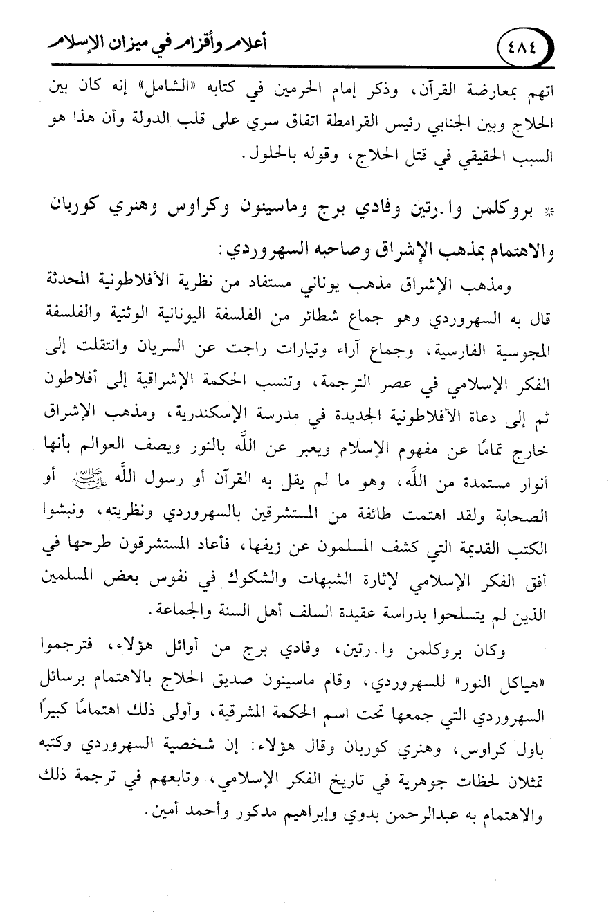 * بروكلمن وا. رتين وفادي برج وماسينون وكراوس وهنري كوربان والاهتمام بمذهب الإِشراق وصاحبه السهروردي: