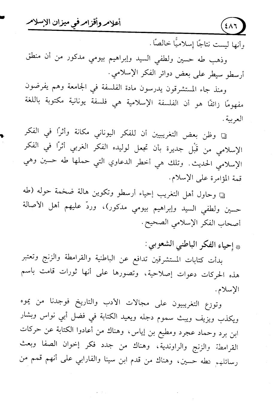- وحاول أهل التغريب إحياء أرسطو وتكوين هالة ضخمة حوله (طه حسين ولطفي السيد وإبراهيم بيومي مدكور)، وردّ عليهم أهل الأصالة أصحاب الفكر الإسلامي الصحيح.
