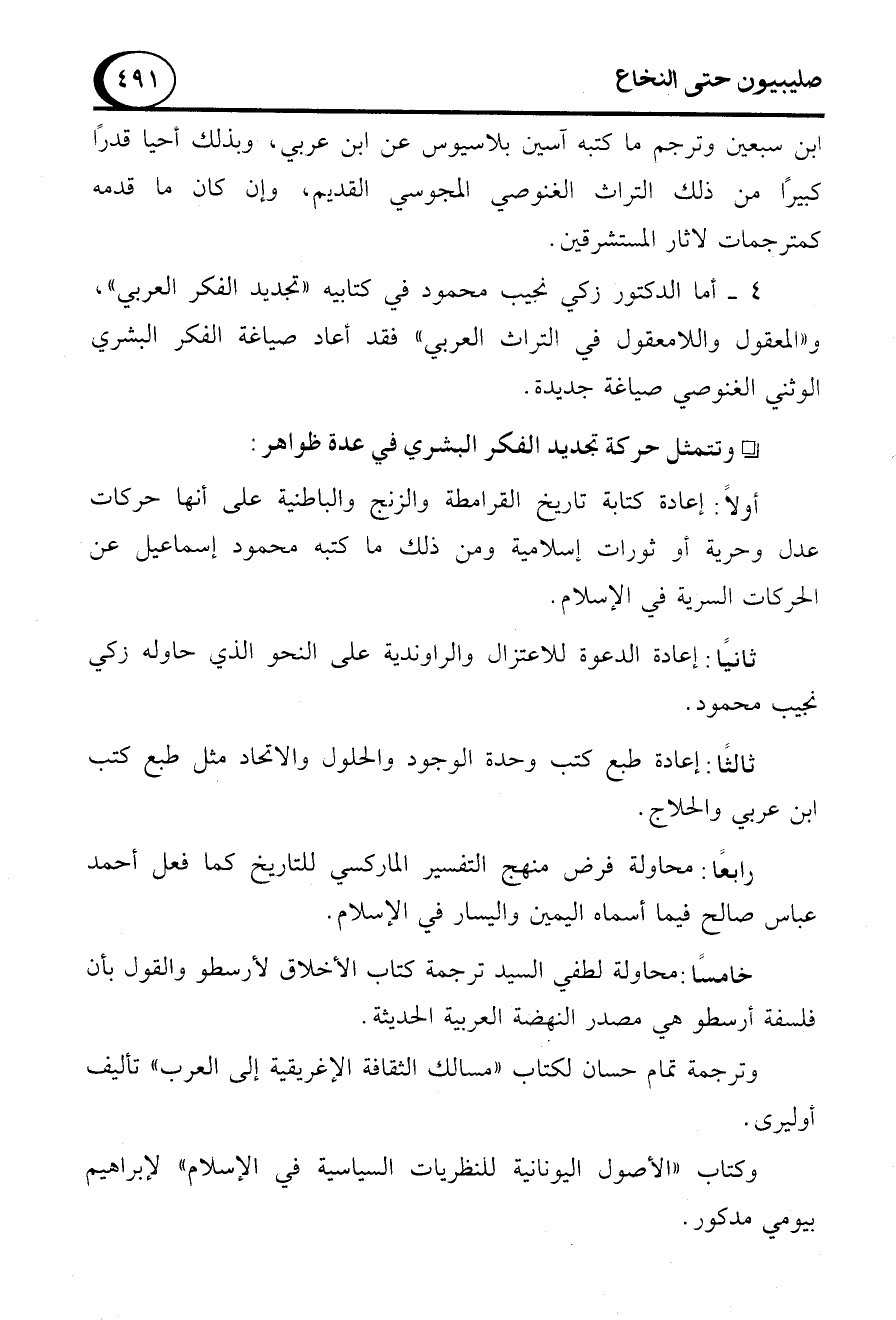 4 - أما الدكتور زكي نجيب محمود في كتابيه "تجديد الفكر العربي"، و"المعقول واللامعقول في التراث العربي" فقد أعاد صياغة الفكر البشري الوثني الغنوصي صياغة جديدة.