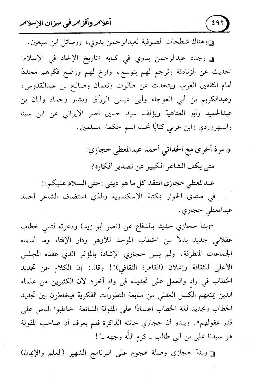 عبد المعطي حجازي انتقد كل ما هو ديني "حتى السلام عليكم"! في منتدى الحوار بمكتبة الإسكندرية والذي استضاف الشاعر أحمد عبد المعطي حجازي. - بدأ حجازي حديثه بالدفاع عن (نصر أبو زيد) ودعوته لتبني خطاب عقلاني جديد بدلاً من الخطاب الموحد للأزهر ودار الإفتاء وما أسماه الجماعات المتطرفة، ولم ينس حجازي الإشادة بالمؤتمر الذي عقده المجلس الأعلى للثقافة وإعلان (القاهرة الثقافي)!! وقال: إن الكلام عن تجديد الخطاب في وادٍ والعمل على تجديده في وادٍ آخر؛ لأن الكثيرين من علماء الدين يمنعهم الكسل العقلي من متابعة التطورات الفكرية فيخلطون بين تجديد الخطاب وتجديد لغة الخطاب اعتمادًا على المقولة الشائعة "خاطبوا الناس على قدر عقولم". ويبدو أن حجازي خانته الذاكرة فلم يعرف أن صاحب المقولة هو سيدنا علي بن أبي طالب -كرم الله وجهه-!!