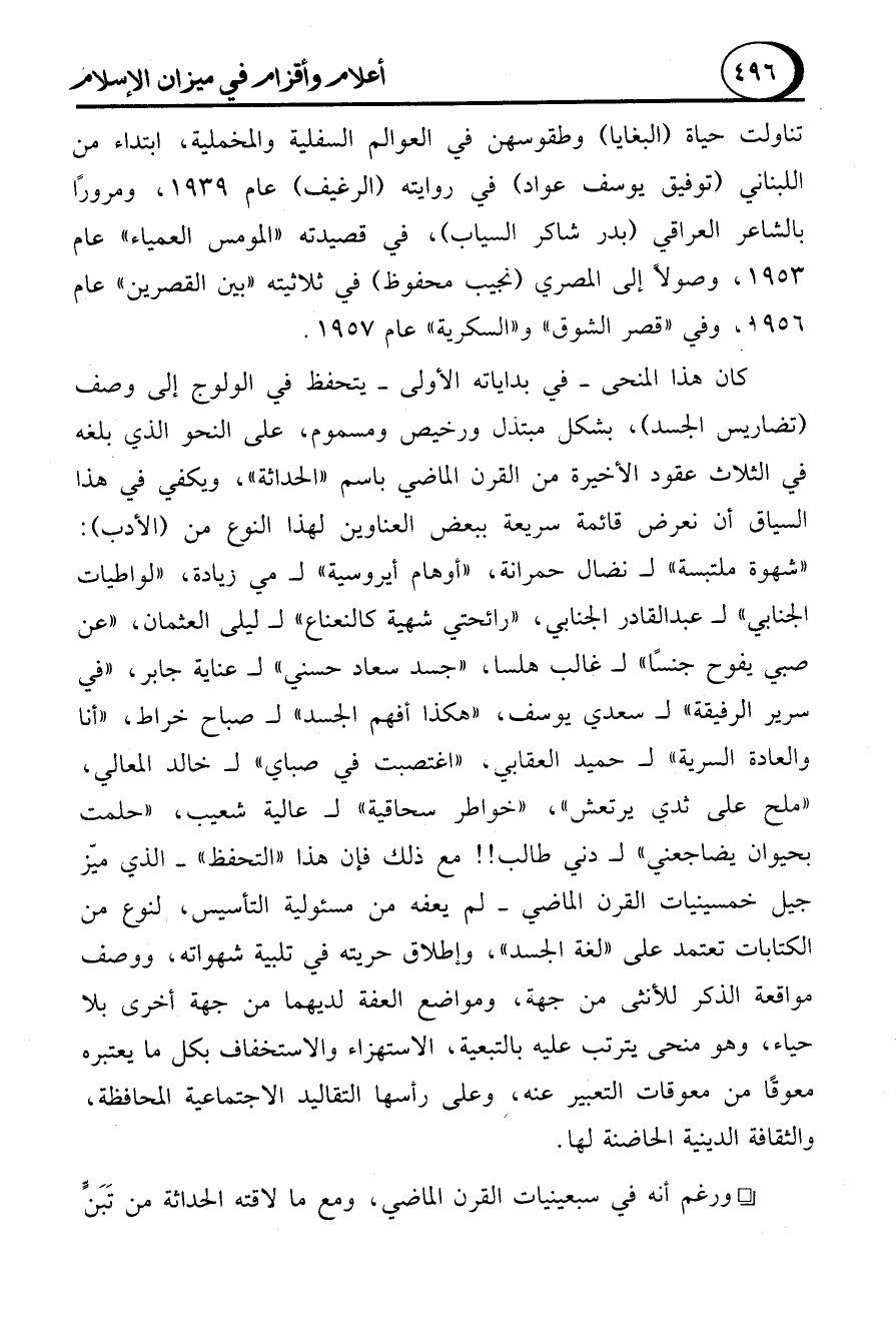 كان هذا المنحى -في بداياته الأولى- يتحفظ في الولوج إلى وصف (تضاريس الجسد)، بشكل مبتذل ورخيص ومسموم، على النحو الذي بلغه في الثلاث عقود الأخيرة من القرن الماضي باسم "الحداثة"، ويكفي في هذا السياق أن نعرض قائمة سريعة ببعض العناوين لهذا النوع من (الأدب):