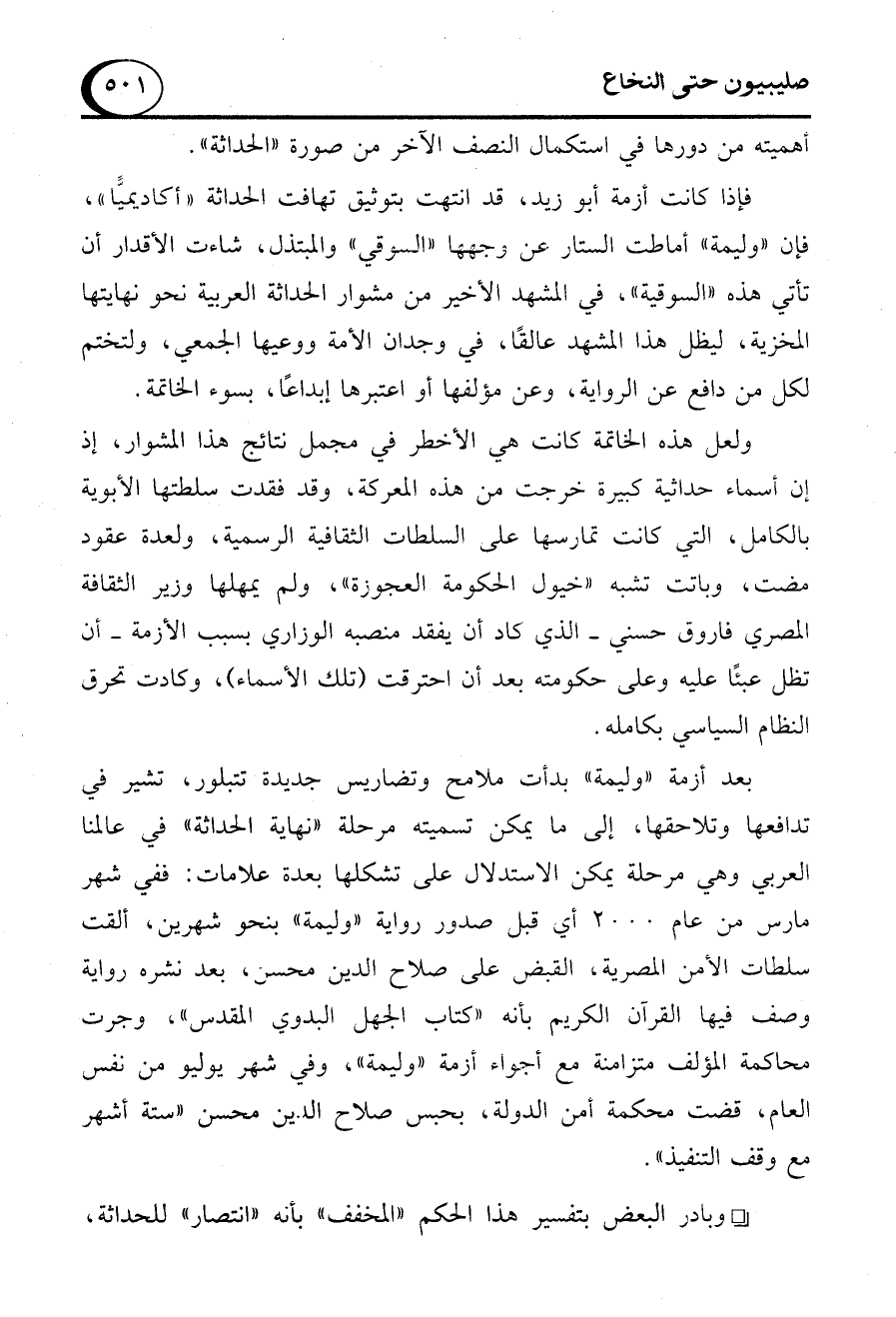بعد أزمة "وليمة" بدأت ملامح وتضاريس جديدة تتبلور، تشير في تدافعها وتلاحقها، إلى ما يمكن تسميته مرحلة "نهاية الحداثة" في عالمنا العربي وهي مرحلة يمكن الاستدلال على تشكلها بعدة علامات: ففي شهر مارس من عام 2000 أي قبل صدور رواية "وليمة" بنحو شهرين، ألقت سلطات الأمن المصرية، القبض على صلاح الدين محسن، بعد نشره رواية وصف فيها القرآن الكريم بأنه "كتاب الجهل البدوي المقدس"، وجرت محاكمة المؤلف متزامنة مع أجواء أزمة "وليمة"، وفي شهر يوليو من نفس العام، قضت محكمة أمن الدولة، بحبس صلاح الدين محسن "ستة أشهر مع وقف التنفيذ".