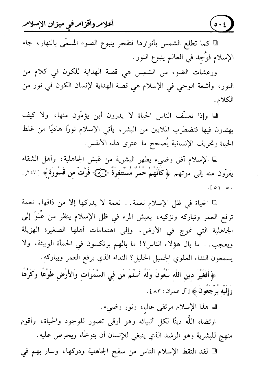 - وإذا تعسّف الناس الحياة لا يدرون أين يؤمّون منها، ولا كيف يهتدون فيها فتضطرب الملايين من البشر، يأتي الإسلام نورًا هاديًا من غلط الحياة وتحريف الإنسانية يُصحح ما اعترى هذه الأنفس.