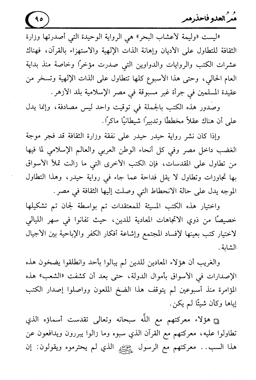 وإذا كان نشر رواية حيدر حيدر على نفقة وزارة الثقافة قد فجر موجة الغضب داخل مصر وفي كل أنحاء الوطن العربي والعالم الإسلامي لما فيها من تطاول على المقدسات، فإن الكتب الأخرى التي ما زالت تملأ الأسواق بها تجاوزات وتطاول لا يقل فداحة عما جاء في رواية حيدر، وهذا التطاول الموجه يدل على حالة الانحطاط التي وصلت إليها الثقافة في مصر.