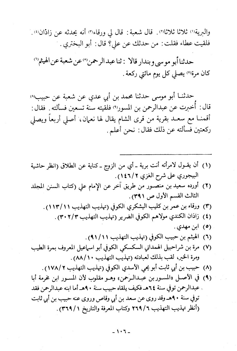 حَدَّثَنَا أَبُو مُوسَى وبُنْدَارٌ قَالَ: ثَنَا عَبْدُ الرَّحْمَنِ [5] عَنْ شُعْبَةَ عَنِ الْهَيْثَمِ [6] كَانَ مُرَّةُ [7] يُصَلِّي كُلَّ يَوْمٍ مِائَتَيْ رَكْعَةٍ.