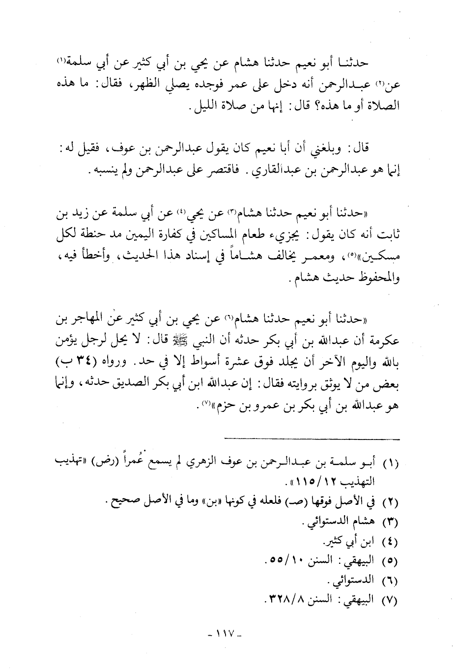 حَدَّثَنَا أَبُو نُعَيْمٍ حدثنا هشام [5] عن يحي بن أبي كثير عن المهاجر ابن عِكْرِمَةَ أَنَّ عَبْدَ اللَّهِ بْنِ أَبِي بَكْرٍ حَدَّثَهُ أَنَّ النَّبِيَّ صَلَّى اللَّهُ عَلَيْهِ وَسَلَّمَ قَالَ: لَا يَحِلُّ لِرَجُلٍ يُؤْمِنُ باللَّه وَالْيَوْمِ الْآخِرِ أَنْ يَجْلِدَ فَوْقَ عَشْرَةِ أَسْوَاطٍ إِلَّا في حد. ورواه (34 ب) بَعْضُ مَنْ لَا يُوثَقُ بِرِوَايَتِهِ فَقَالَ: إِنَّ عبد الله ابن أَبِي بَكْرٍ الصِّدِّيقِ حَدَّثَهُ، وَإِنَّمَا هُوَ عَبْدُ اللَّهِ بْنُ أَبِي بَكْرِ بْنِ عَمْرِو بْنِ حزم.