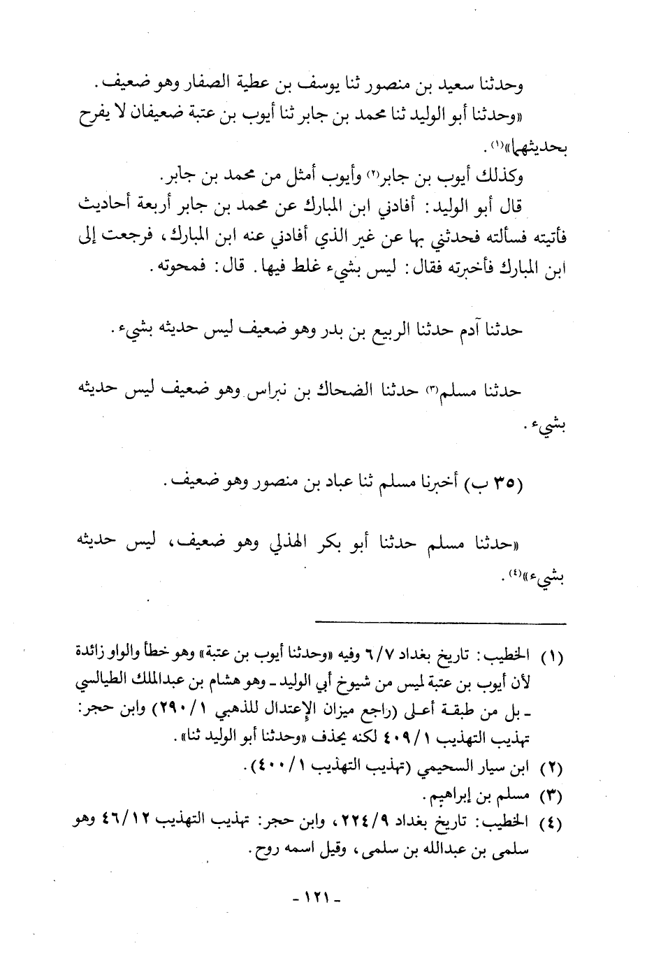 [1] الخطيب: تاريخ بغداد 7/ 6 وفيه «وحدثنا أيوب بن عتبة» وهو خطأ والواو زائدة لان أيوب بن عتبة ليس من شيوخ أبي الوليد- وهو هشام بن عبد الملك الطيالسي- بل من طبقة أعلى (راجع ميزان الاعتدال للذهبي 1/ 290) وابن حجر: تهذيب التهذيب 1/ 409 لكنه يحذف «وحدثنا ابو الوليد ثنا» .