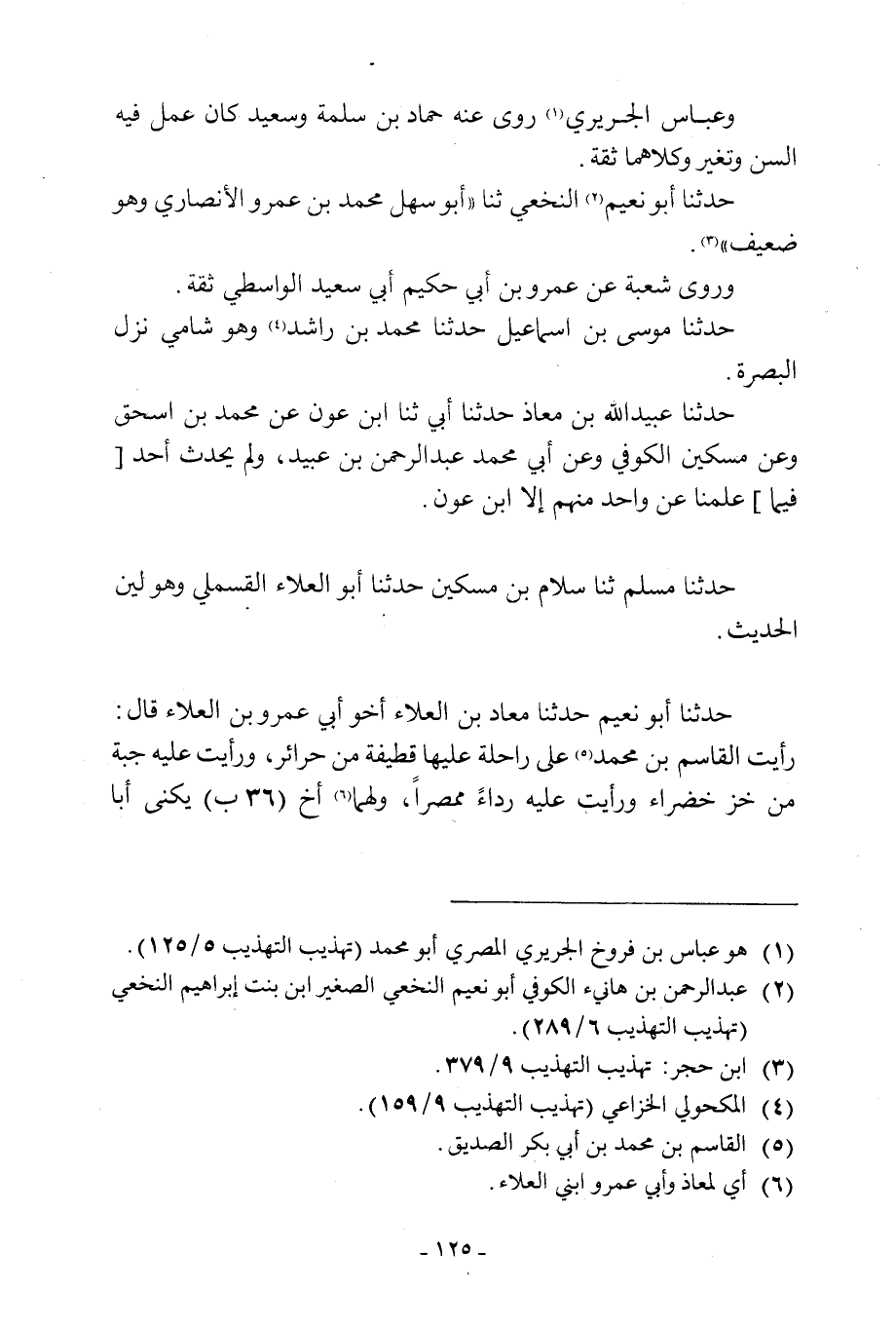 وَعَبَّاسٌ الْجَرِيرِيُّ [1] رَوَى عَنْهُ حَمَّادُ بْنُ سَلَمَةَ وَسَعِيدٌ كَانَ عَمِلَ فِيهِ السِّنُّ وَتَغَيَّرَ وَكِلَاهُمَا ثِقَةٌ.